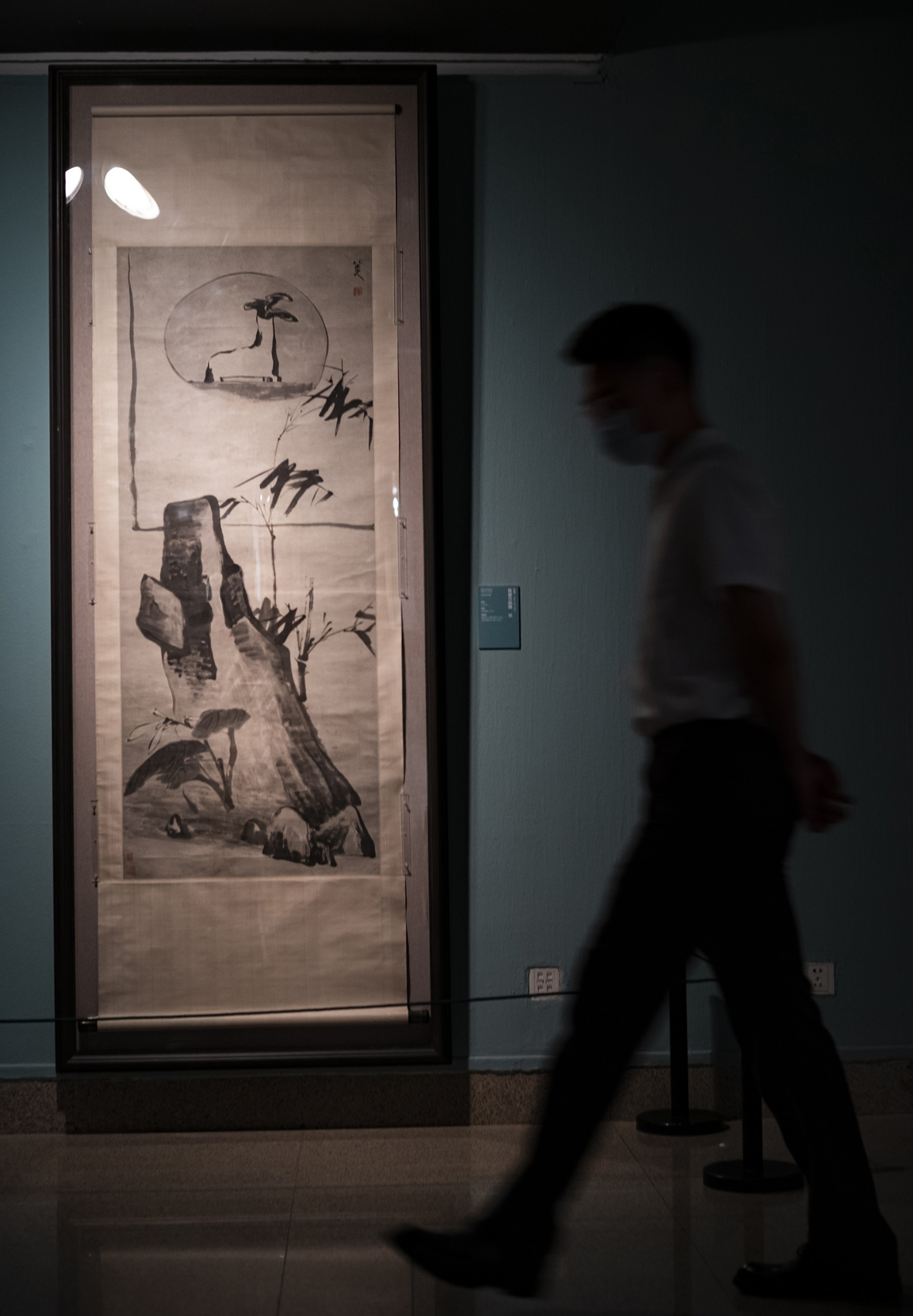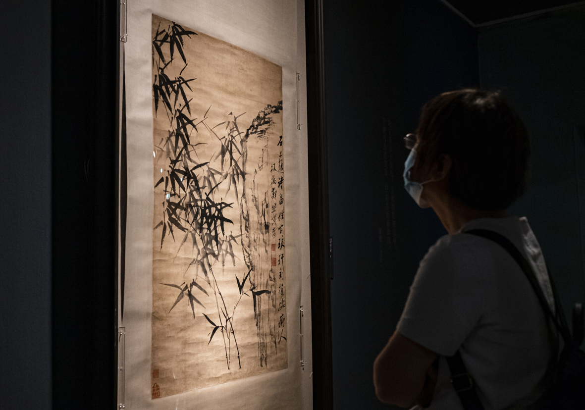 6月23日,观众在位于北京的中国美术馆内参观“斯文传古风——邓拓捐赠古代绘画精品展”,欣赏“八大山人”朱耷作纸本水墨淡设色《秋窗竹韵图》。(图片来源:中新社)