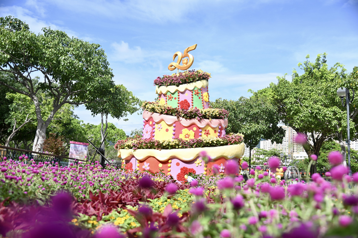 图为沙田区庆回归巨型蛋糕装饰。 (图片来源:中新社)