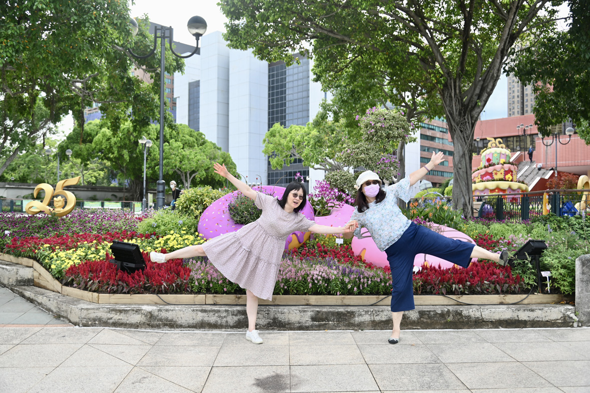 图为市民与庆回归装饰合影。 (图片来源:中新社)