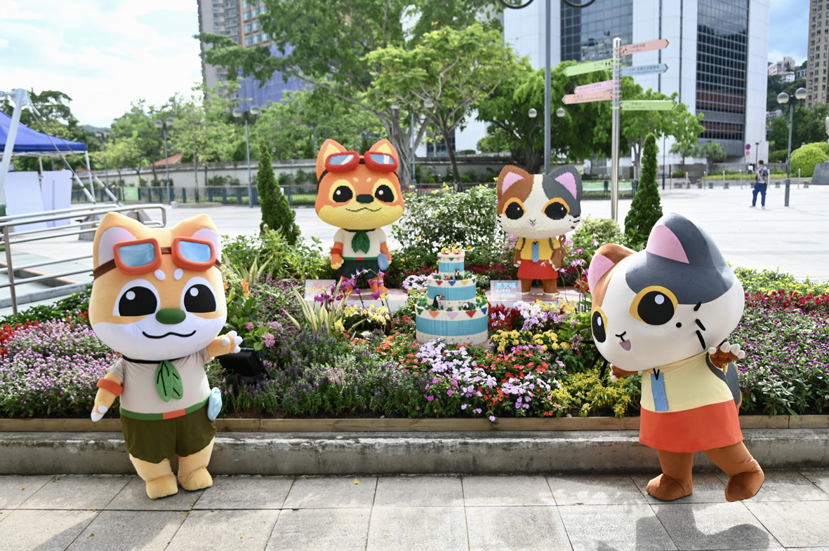 图为康文署吉祥物与庆回归装饰。 (图片来源:中新社)