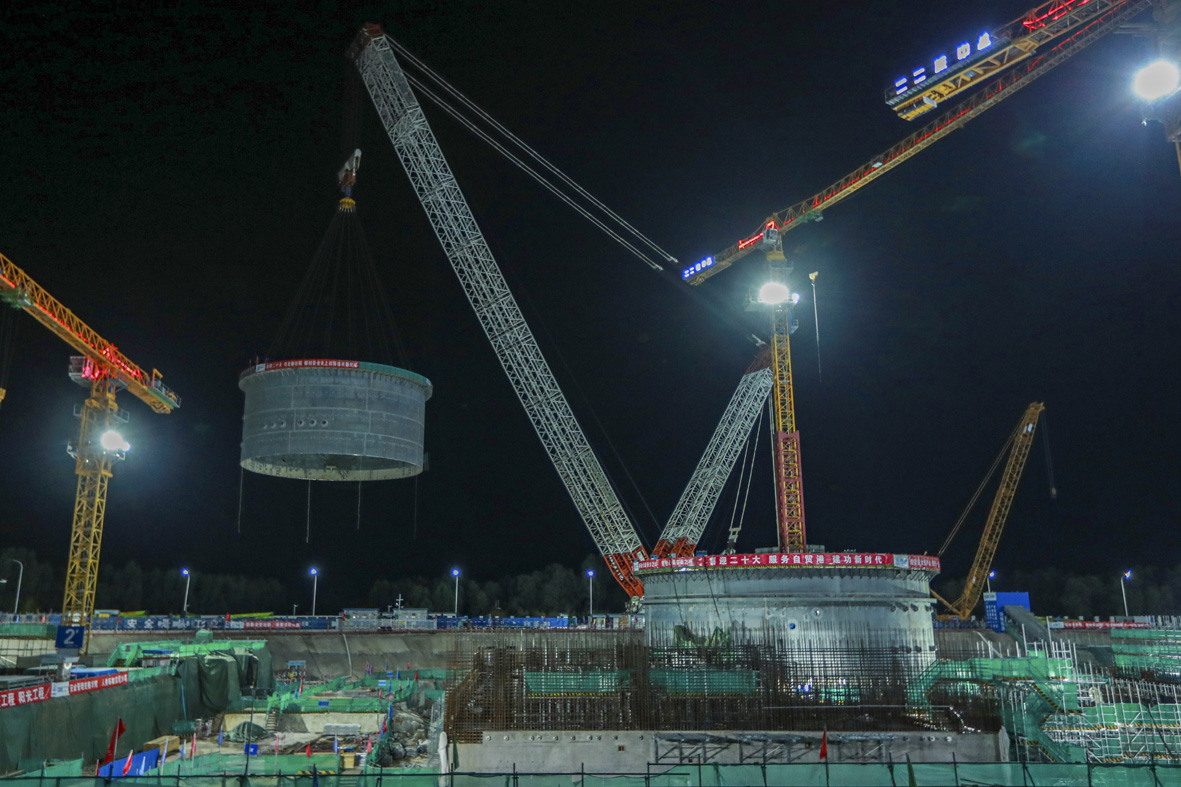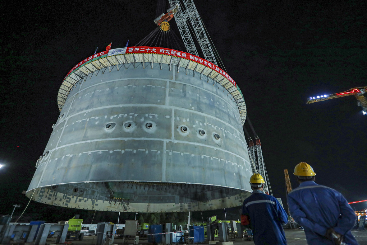 7月6日0时08分,全球首堆“玲龙一号”反应堆厂房钢制安全壳上部筒体,在海南昌江核电基地顺利吊装就位,比计划提前70天完成进度目标。据了解,本次吊装的钢制安全壳上部筒体整体高度约15米,吊装重量约720吨,是“玲龙一号”工程单次重量最大的一次吊装。图为7月5日拍摄的吊装现场。(无人机照片)(图片来源:中新社)