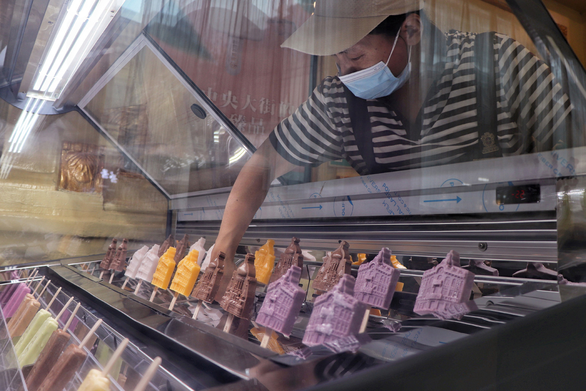 7月7日,“小暑”节气,在哈尔滨“百年老街”中央大街的马迭尔冷饮厅内,以圣索菲亚教堂、中华巴洛克风情街等哈尔滨地标建筑为造型的文创雪糕,吸引市民观赏并购买品尝。 (图片来源:中新社)