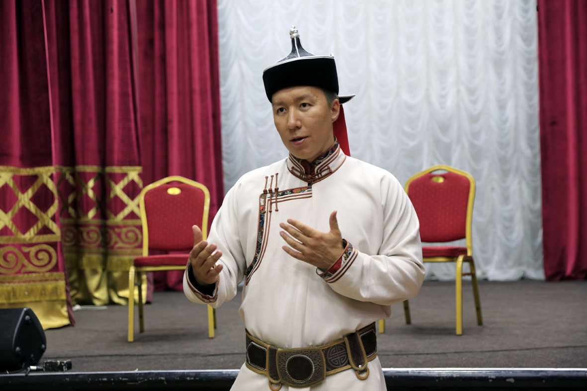 当地时间7月15日,图瓦共和国首府克孜勒市,在图瓦传统文化和手工艺发展中心,身着传统民族服饰的表演者介绍喉音唱法“呼麦”的不同发音方法。图瓦人的喉音演唱已成为该共和国的非官方象征,享誉全球。 (图片来源:中新社)