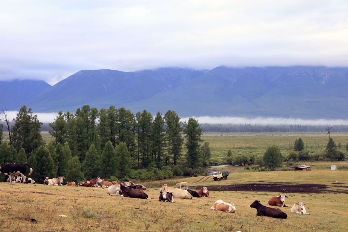 当地时间7月15日,图瓦共和国切季霍尔区的一个夏季牧场,远处是白云环绕的唐努乌拉山脉。(图片来源:中新社)