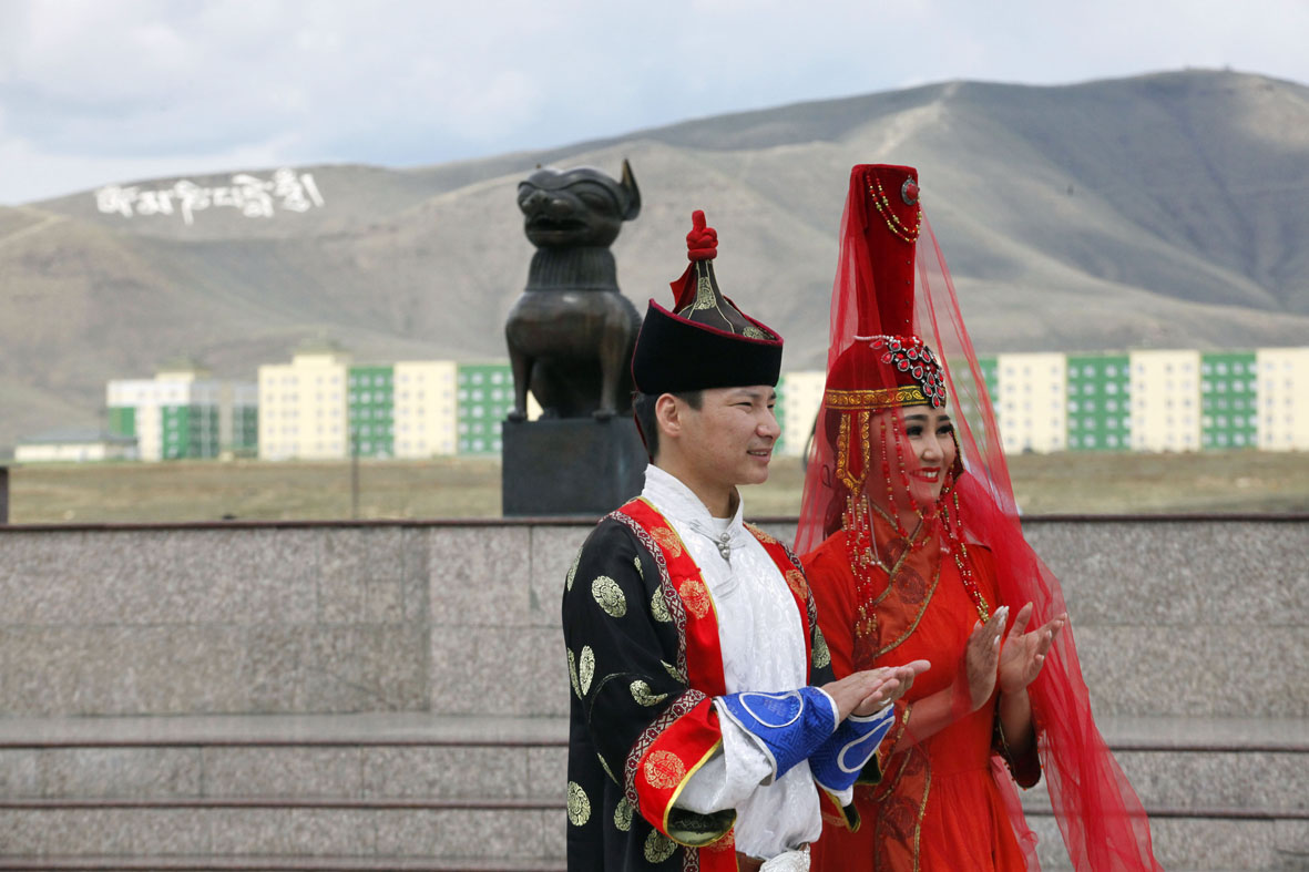 当地时间7月15日,图瓦共和国首府克孜勒市,身着传统民族服饰的当地青年。(图片来源:中新社)