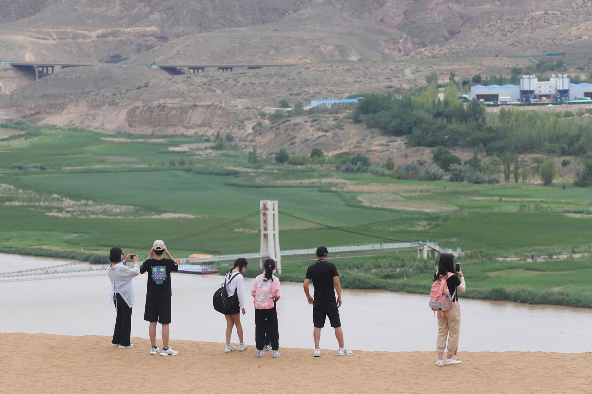 7月18日,游客在宁夏中卫市沙坡头景区欣赏“沙河共色”景观。宁夏中卫市沙坡头景区位于腾格里沙漠边缘,黄河从旁穿过,形成了“沙河共色”的景观,每年夏季各地慕名而来的游客络绎不绝。(图片来源:中新社)
