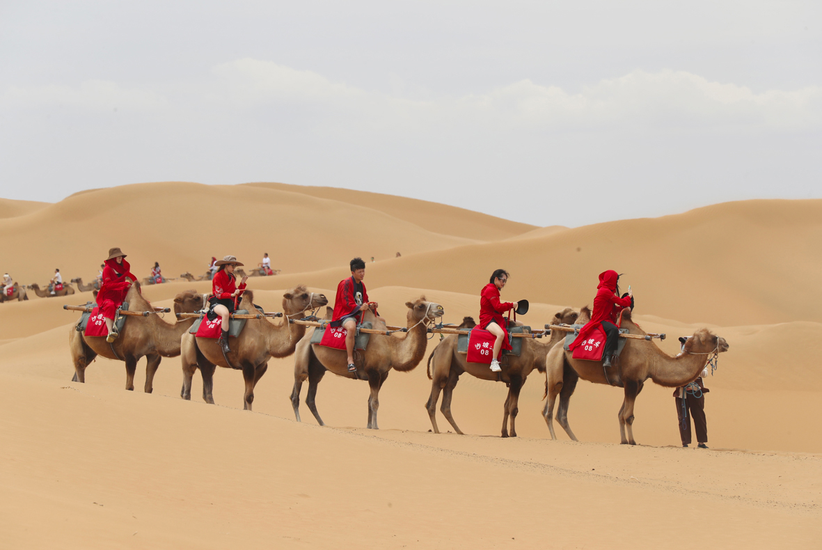 7月18日,游客在宁夏中卫市沙坡头景区骑骆驼穿越沙海。(图片来源:中新社)