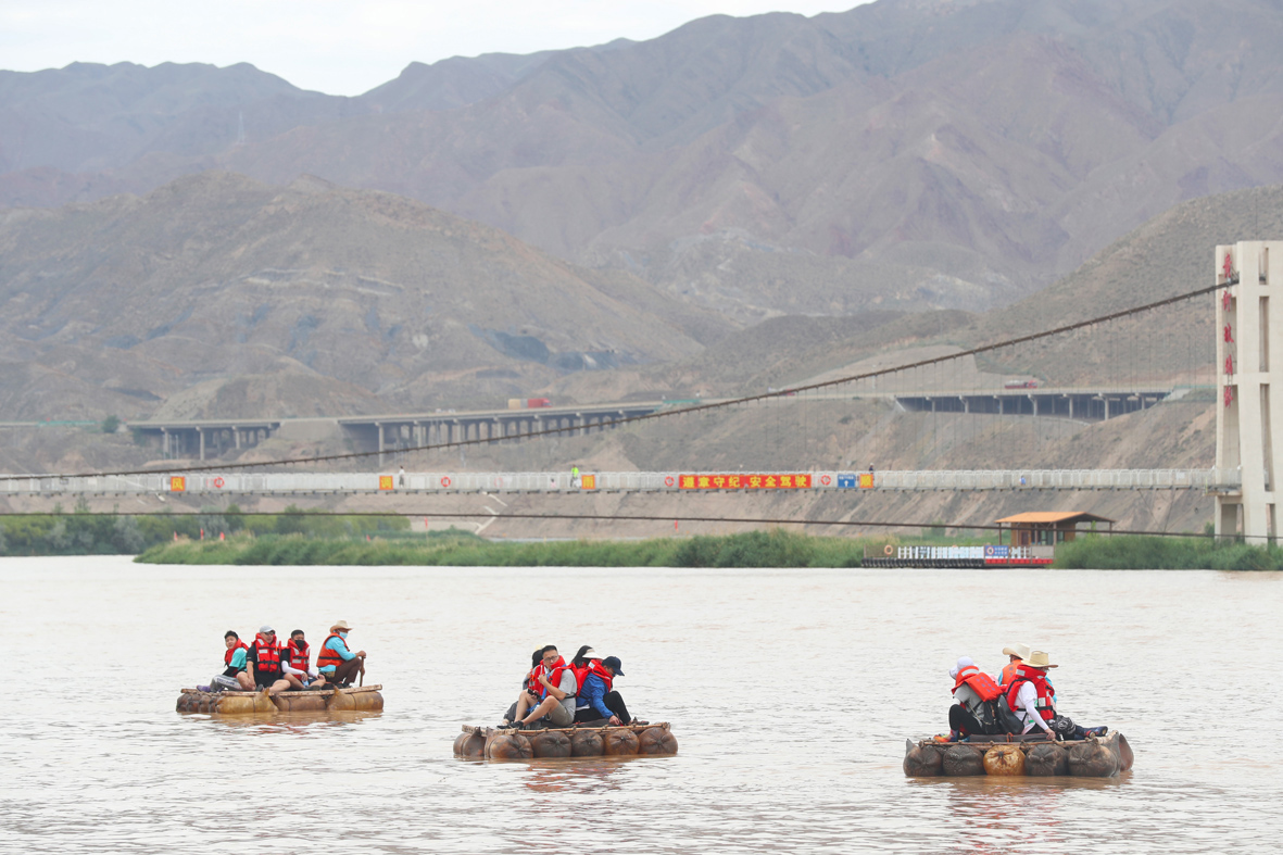 7月18日,游客在宁夏中卫市沙坡头景区乘坐羊皮筏子。(图片来源:中新社)