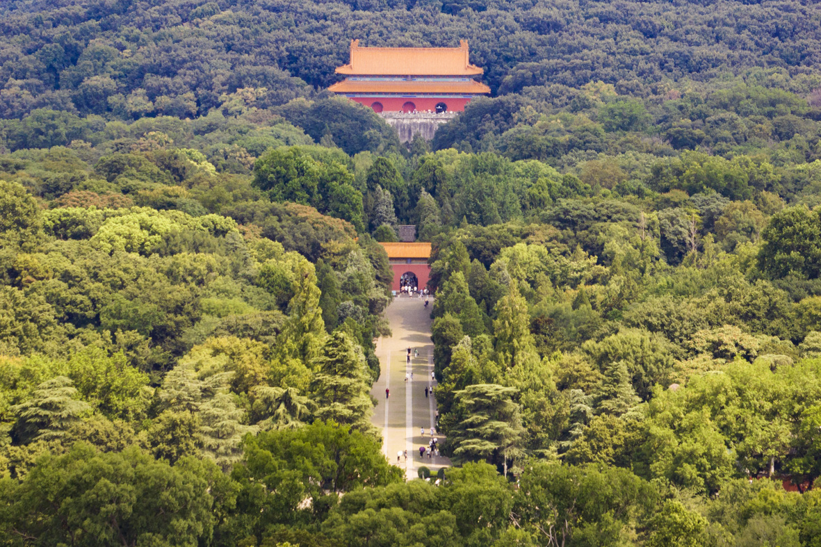 8月2日,江苏南京,游客暑期参观世界文化遗产南京明孝陵,高温下“感知历史”。距今已有600多年历史的明孝陵位于南京东郊钟山南麓,是明朝开国皇帝朱元璋与皇后马氏的陵寝。2003年,明孝陵作为明清皇家陵寝扩展项目列入《世界遗产名录》。(无人机照片)(图片来源:中新社)