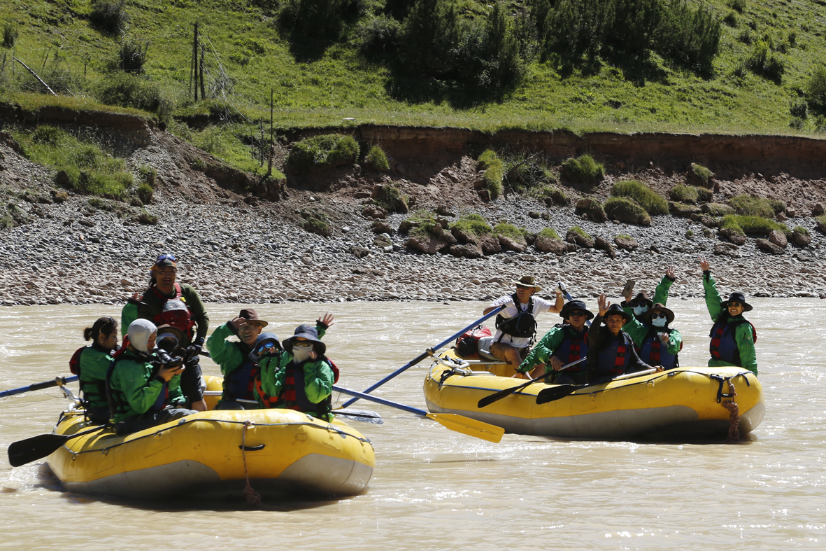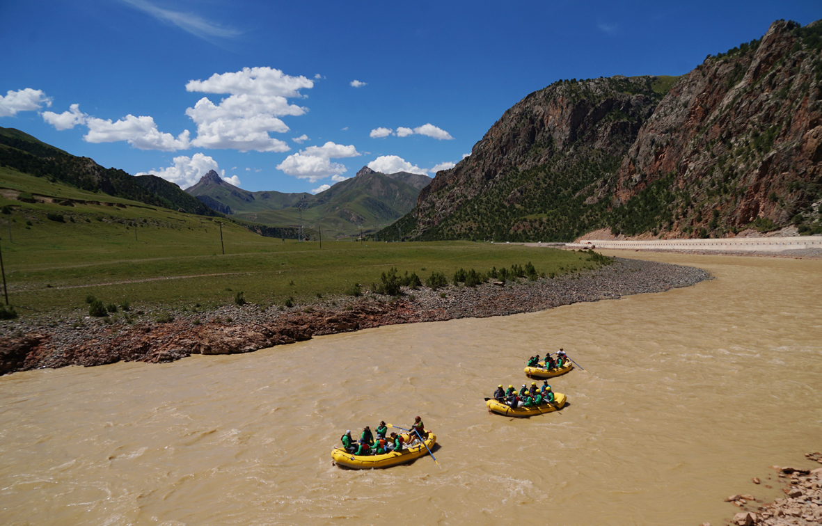 8月9日,“同饮一江水光影耀澜湄”2022澜湄国际影像周在澜沧江源第一县青海玉树藏族自治州杂多县正式启动,中外嘉宾体验澜沧江漂流。 (图片来源:中新社)
