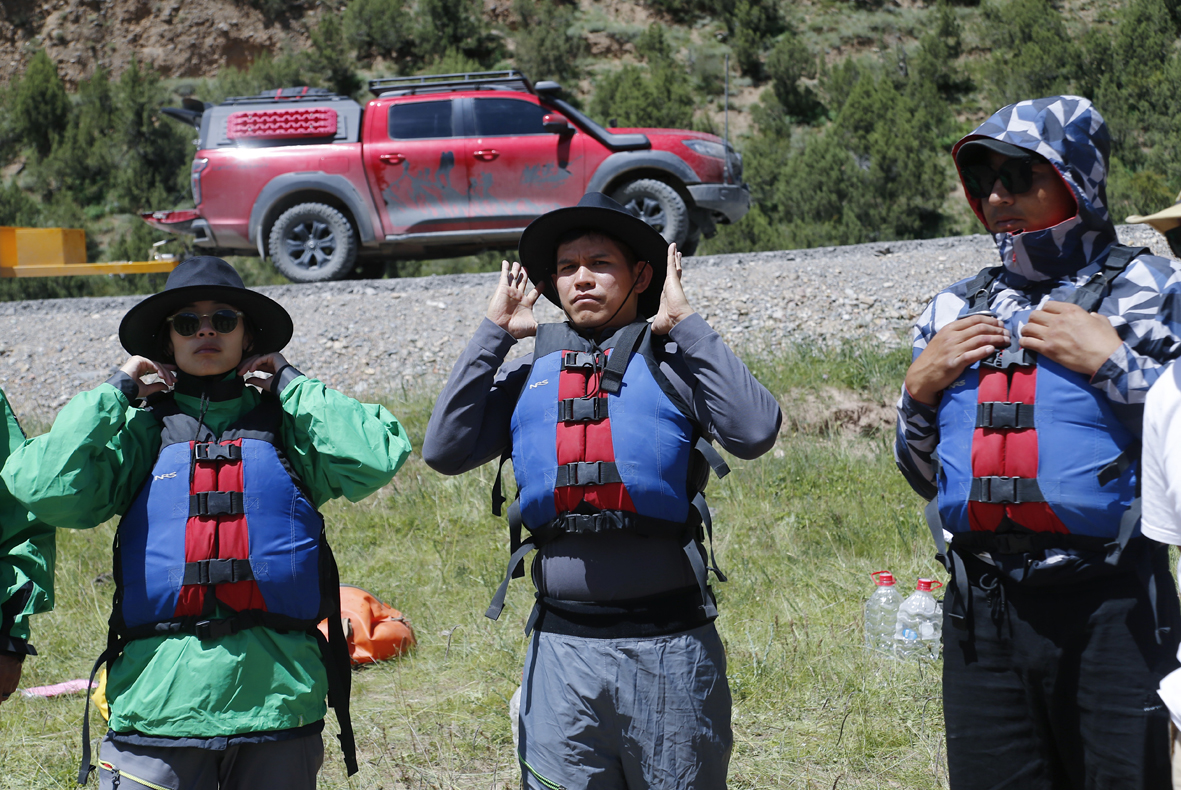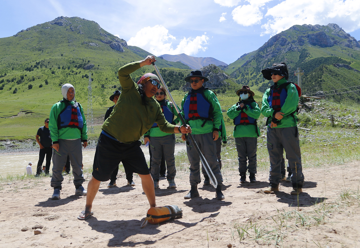 图为中外嘉宾学习漂流技巧及注意事项。(图片来源:中新社)