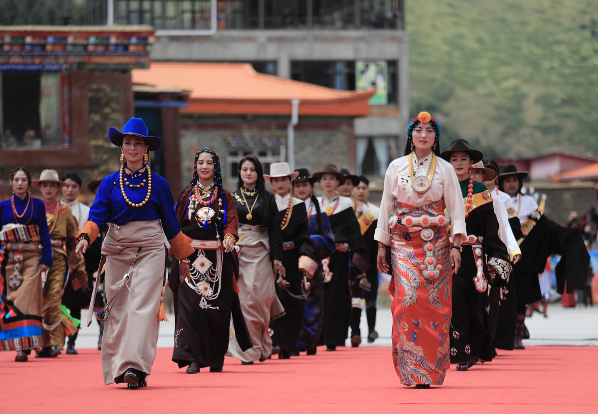 8月18日,四川省阿坝藏族羌族自治州壤塘县2022年“壤巴拉文旅”活动开幕式在中壤塘镇举行。图为民族服饰走秀表演。 (图片来源:中新社)