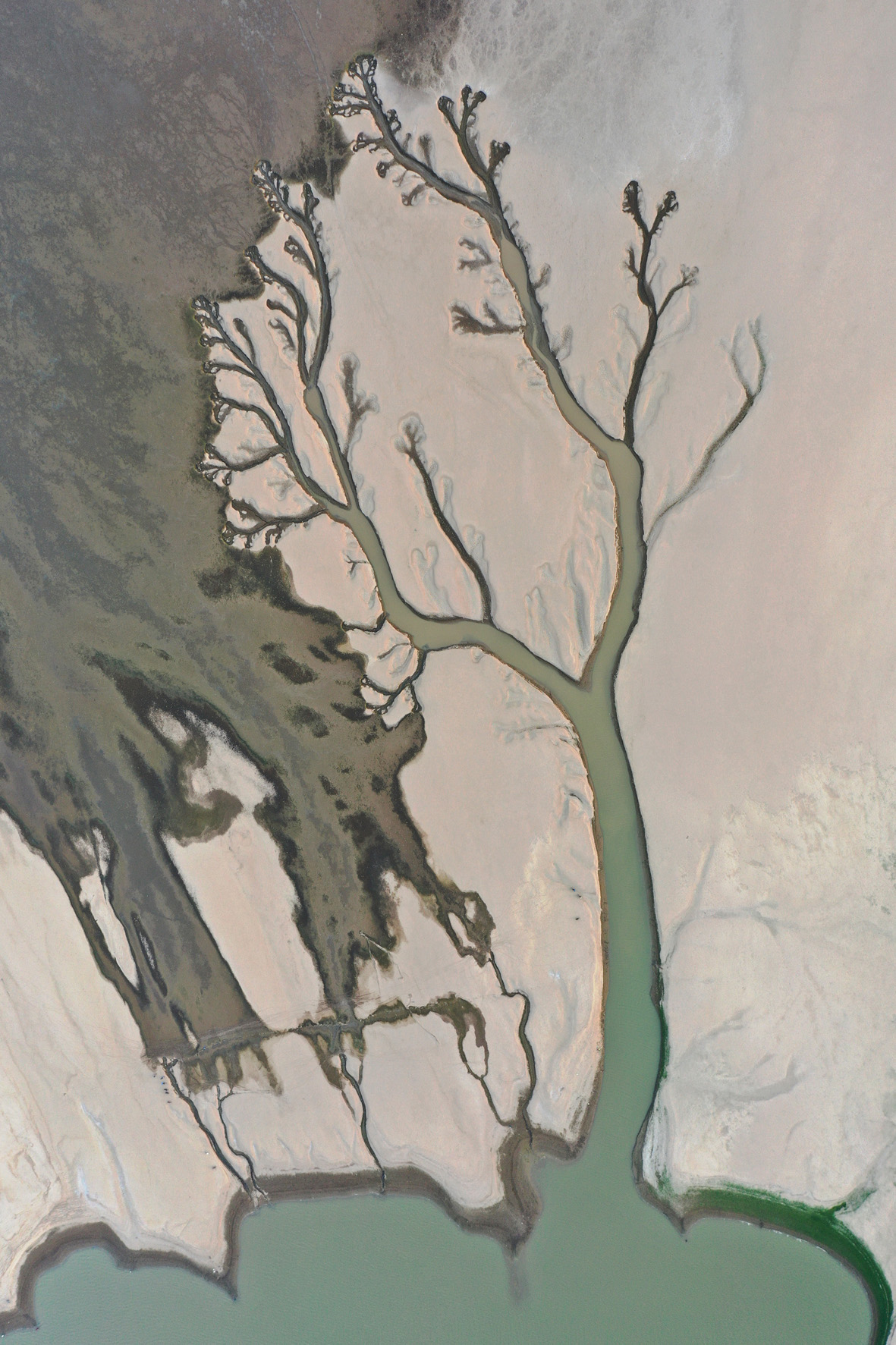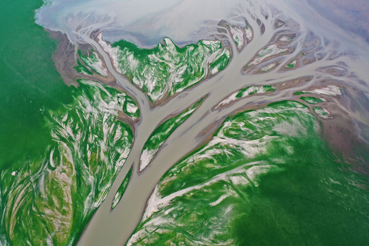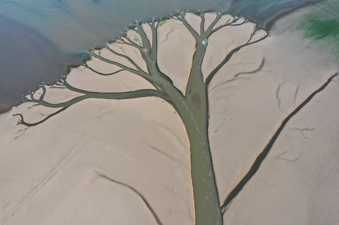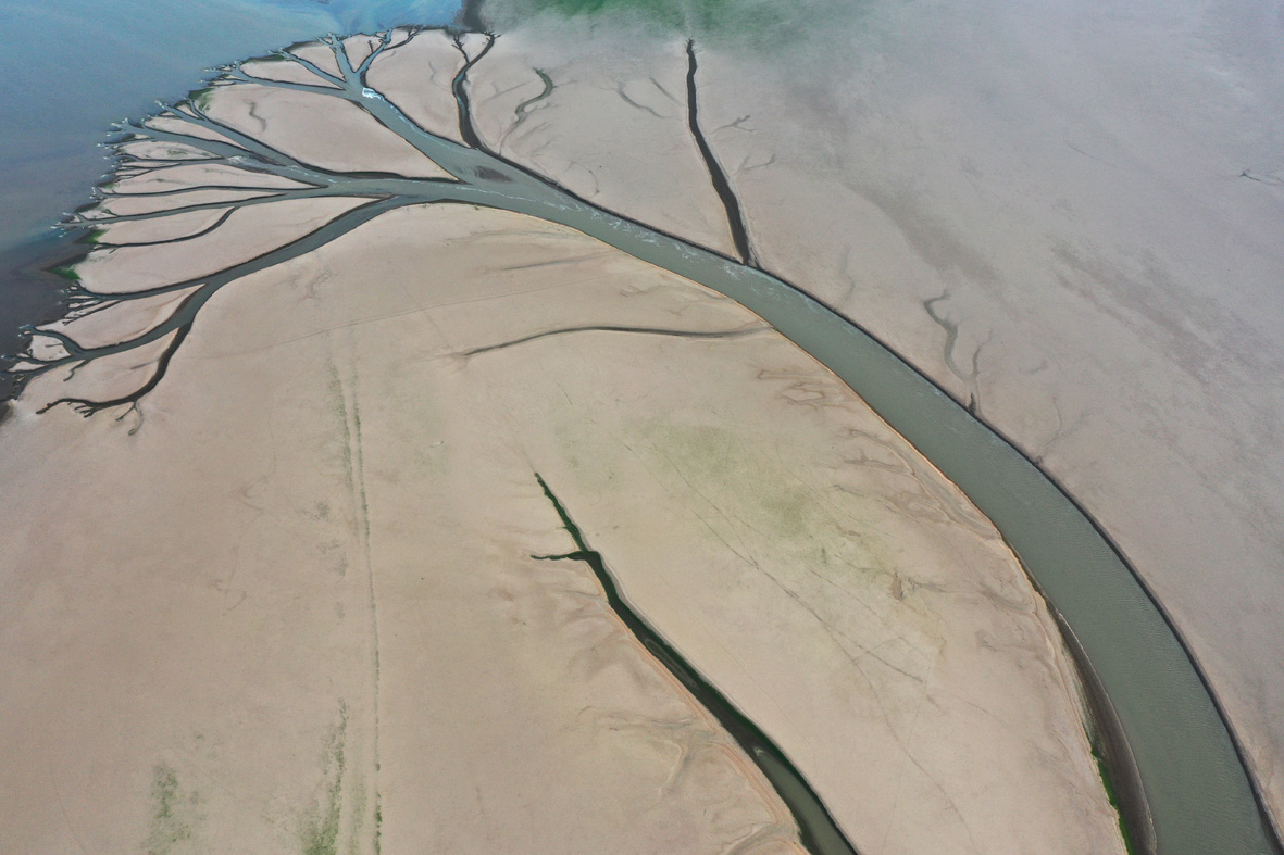8月23日,江西南昌,中国最大淡水湖鄱阳湖核心湖区进贤县金溪湖水域,出现“大地之树”自然景观。受降水偏少及持续高温影响,中国长江流域出现罕见旱情,鄱阳湖提前进入低枯水期,刷新最早进入低枯水期记录,鄱阳湖水体面积较今年7月初已缩小近70%。(无人机照片) (图片来源:中新社)