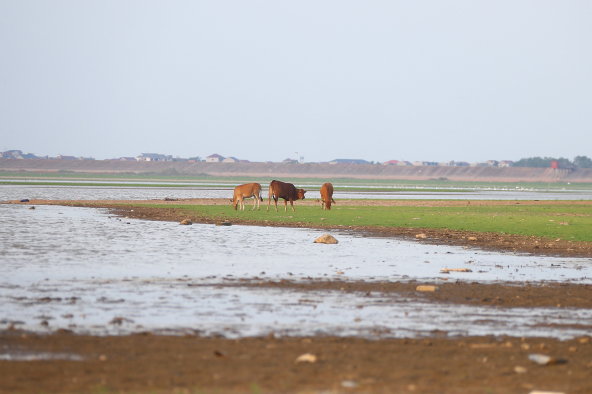 8月23日,江西南昌,江西鄱阳湖核心湖区进贤县金溪湖水域生长大片野草,成为牛的天然牧场。受降水偏少及持续高温影响,中国长江流域出现罕见旱情,鄱阳湖提前进入低枯水期,刷新最早进入低枯水期记录,鄱阳湖水体面积较今年7月初已缩小近70%。(图片来源:中新社)