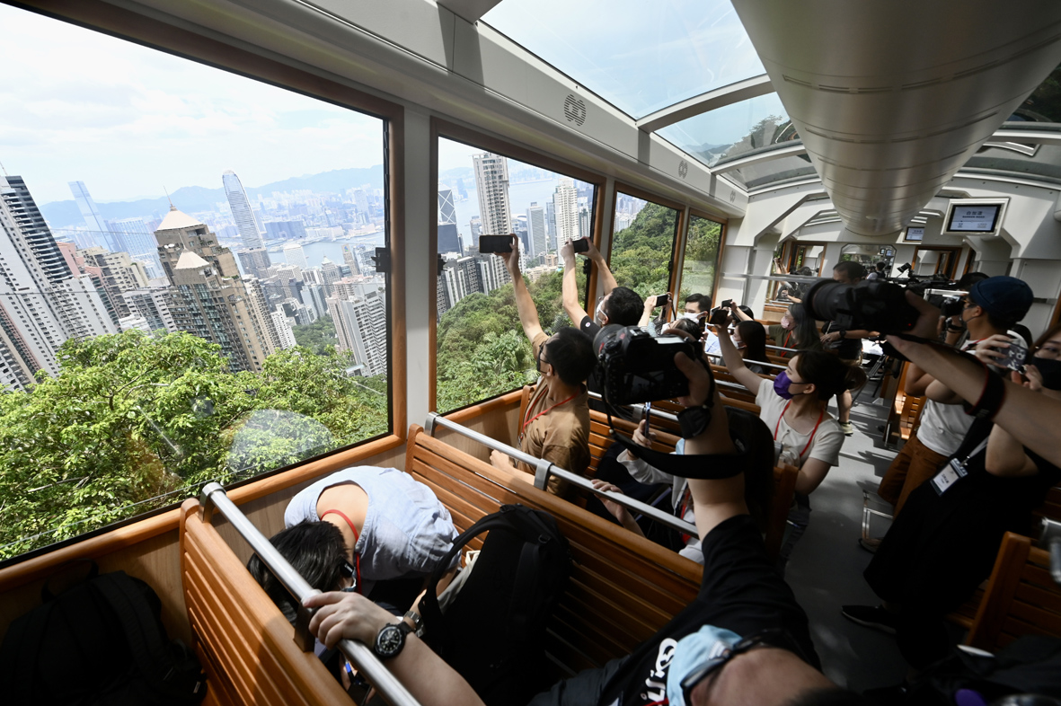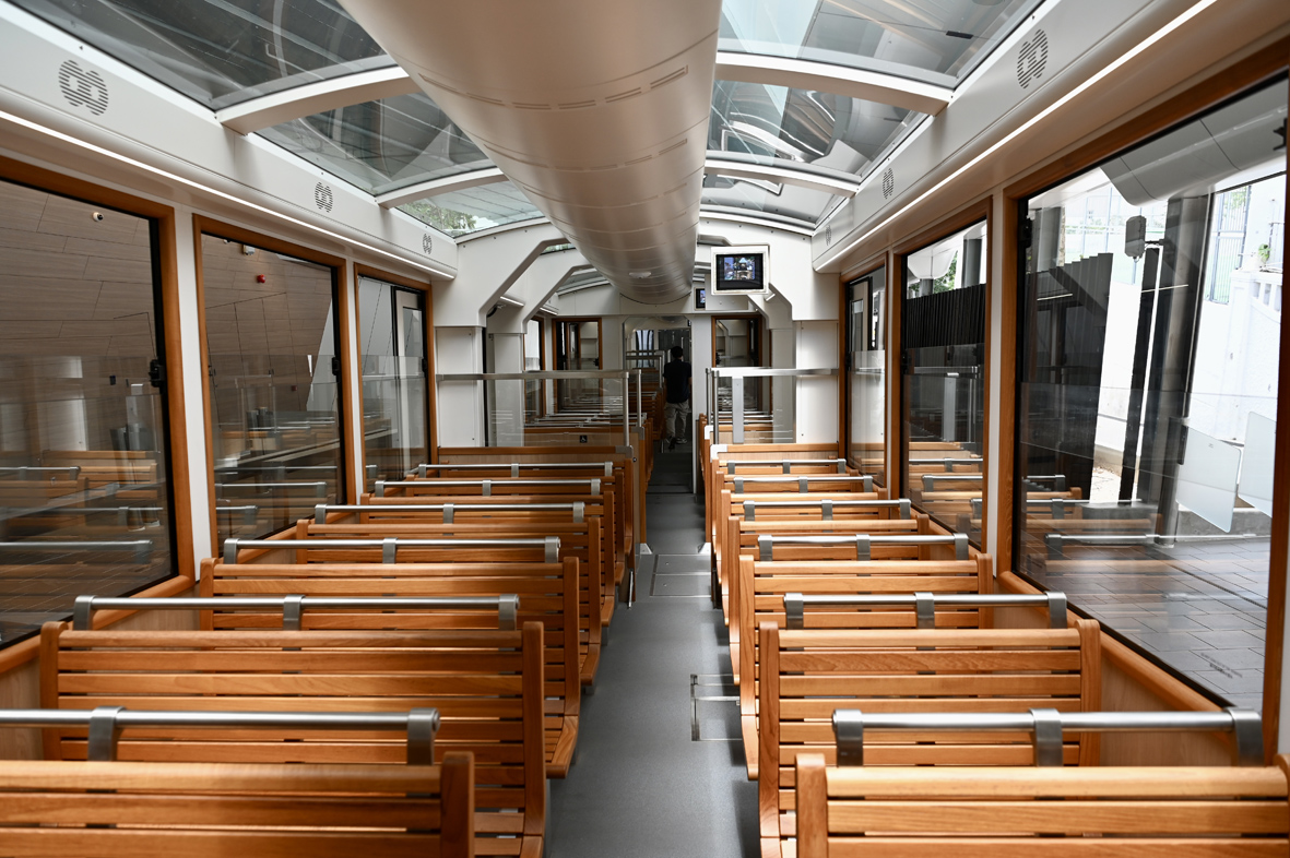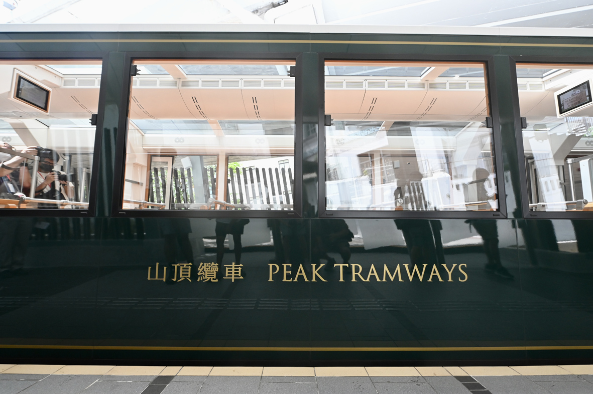 香港第六代山顶缆车将于8月27日上午11时起正式投入服务。24日中午,山顶缆车有限公司安排传媒提前乘坐缆车,体验新一代缆车的全新服务。新山顶缆车更换了动力、控制及信号系统、缆索及轨道,另外缆车内部空间更大及提供更方便残疾人士的措施。车身用上山顶缆车标志性的绿色,代表文化传承并向早期第三代及第四代缆车致敬。图为第六代山顶缆车。 (图片来源:中新社)