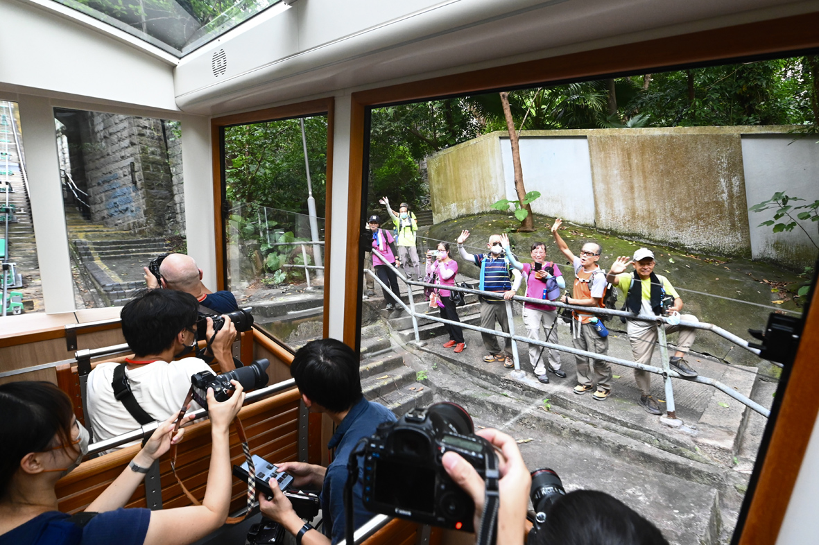 图为市民向乘坐新山顶缆车的传媒挥手。 (图片来源:中新社)