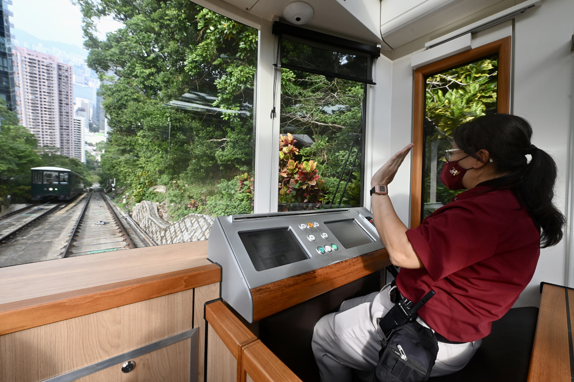 图为驾驶员向另一架行驶中的山顶缆车挥手。 (图片来源:中新社)