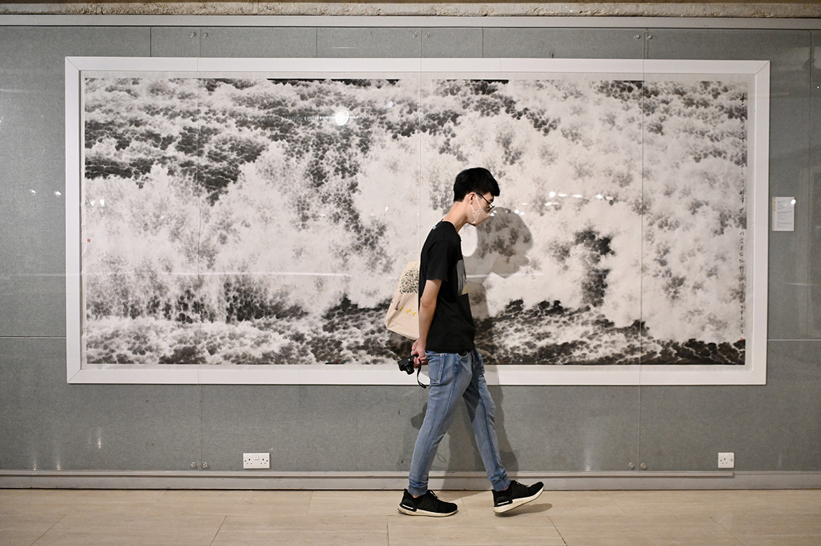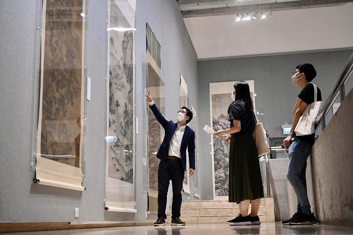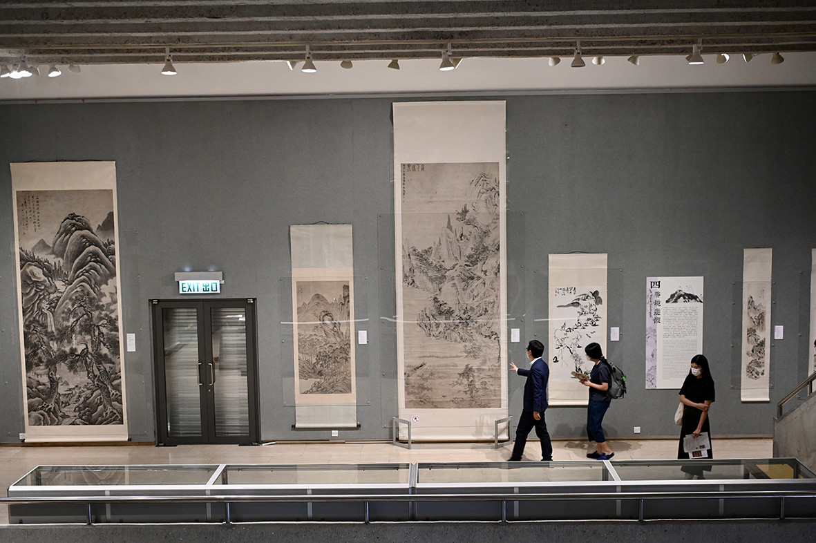 10月5日,香港中文大学文物馆举行“山川巨构:香港中文大学文物馆藏山水画选”传媒预览,展出逾40件尺幅宏巨及构图雄伟、横跨元代至当代的中国山水画,呈现出中国山水画的多种风格与技法,让观众在展览中“游山玩水”,欣赏大自然及笔墨之美。图为香港中大的中国山水画展览。(图片来源:中新社)