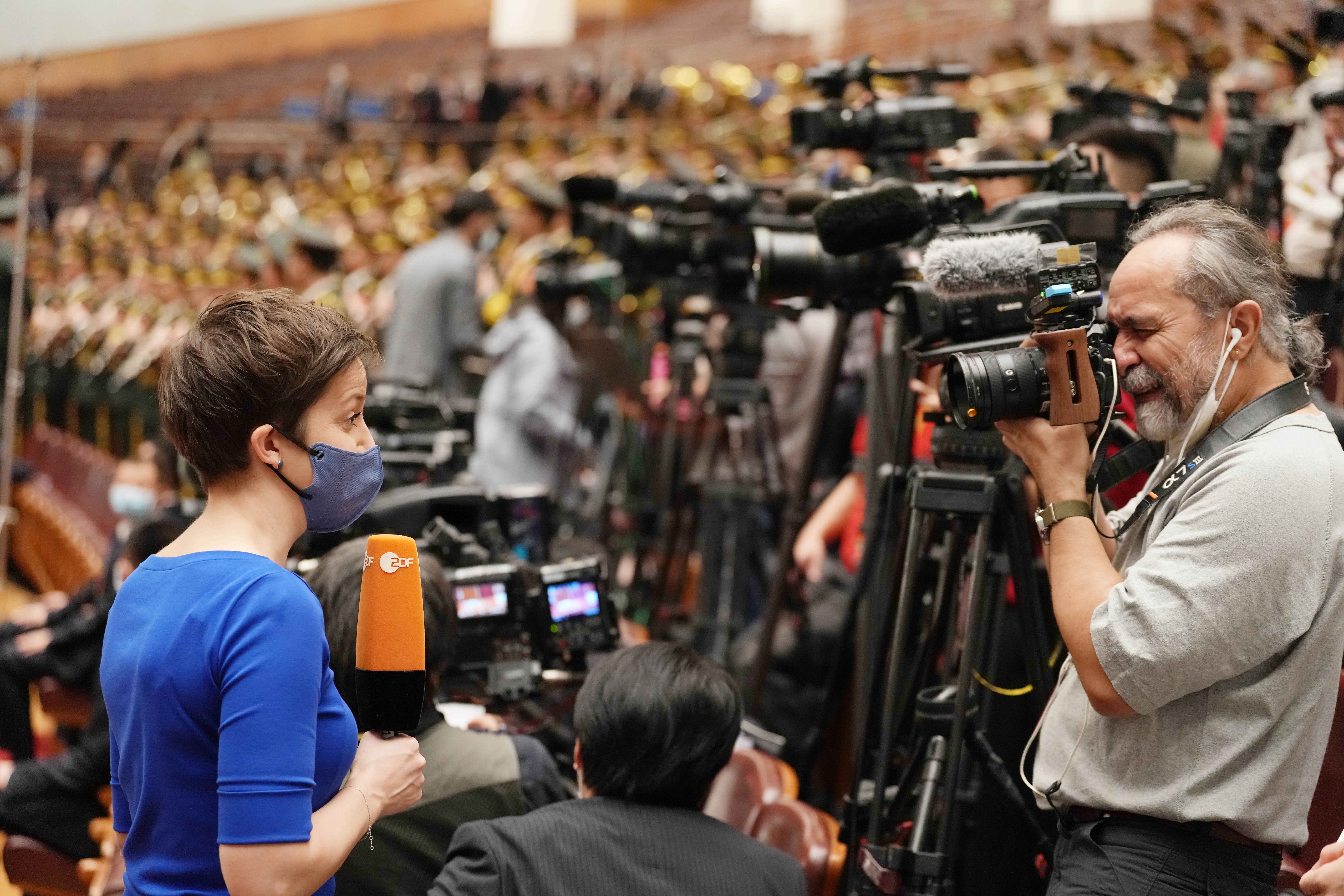 10月16日,中国共产党第二十次全国代表大会在北京人民大会堂隆重开幕。图为记者在采访。 (图片来源:中新社)