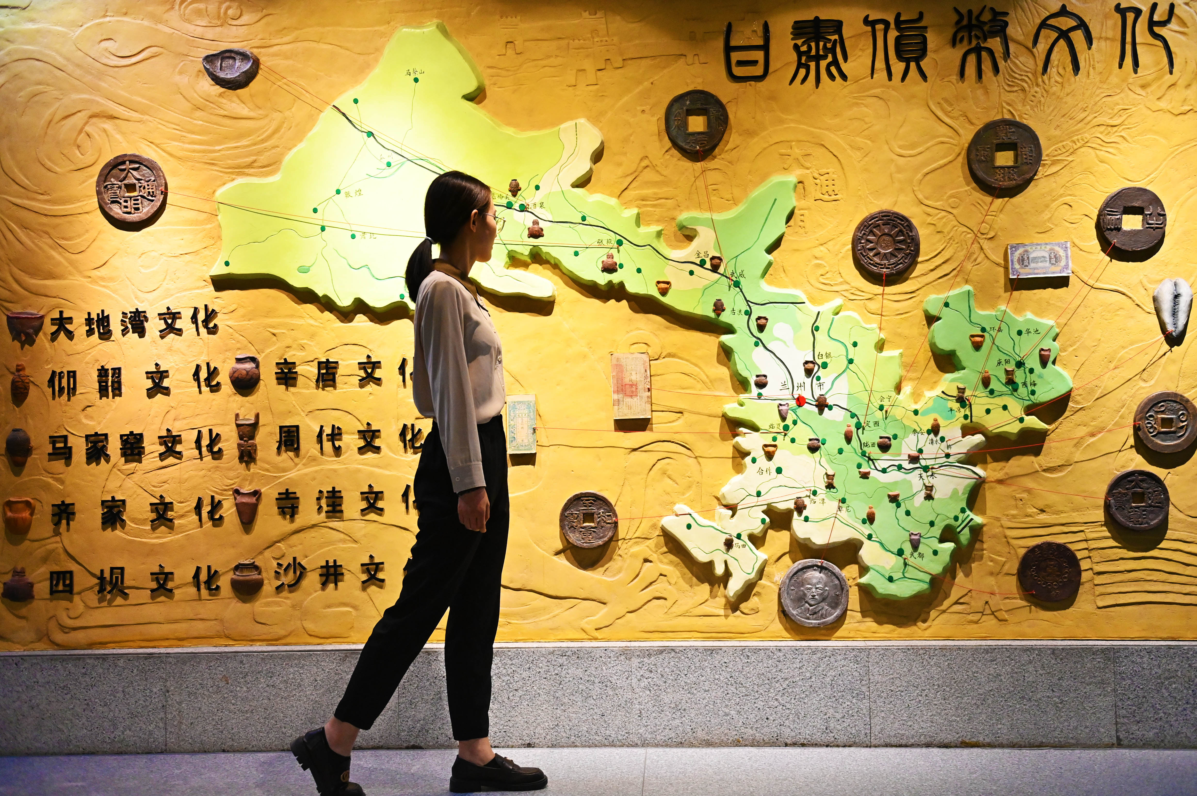 10月20日,在位于兰州市的甘肃钱币博物馆内,参观者走过“甘肃货币文化”展台。该系列货币反映了甘肃在土地革命时期至解放战争时期的货币历史。据了解,该馆收藏了古今中外钱币等文物近万件。(图片来源:中新社)
