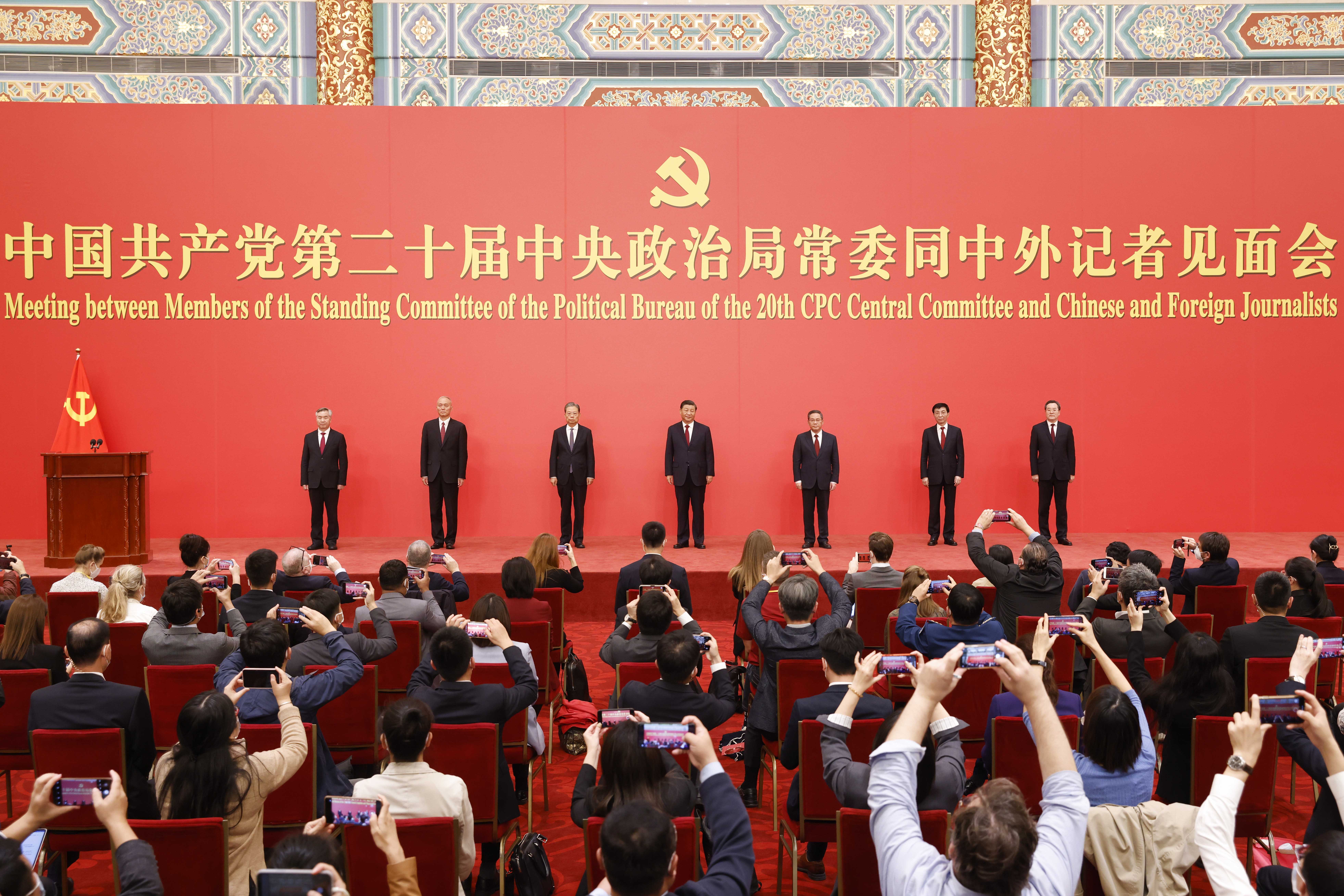 10月23日,刚刚在中国共产党第二十届中央委员会第一次全体会议上当选的中共中央总书记习近平和中共中央政治局常委李强、赵乐际、王沪宁、蔡奇、丁薛祥、李希在北京人民大会堂同中外记者亲切见面。(图片来源:中新社)