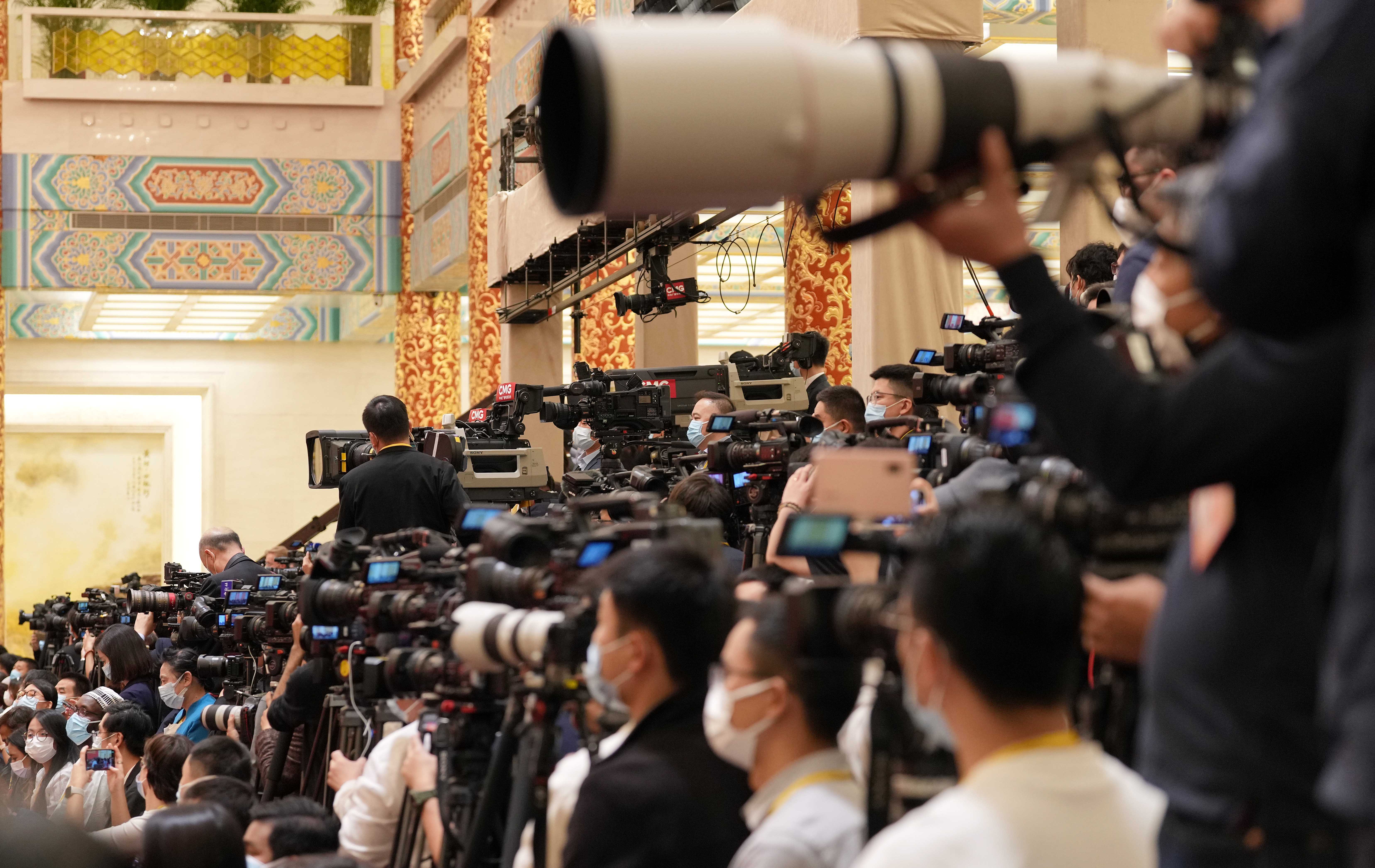 10月23日,中外记者在北京人民大会堂报道新一届中共中央政治局常委首次集体亮相。(图片来源:中新社)