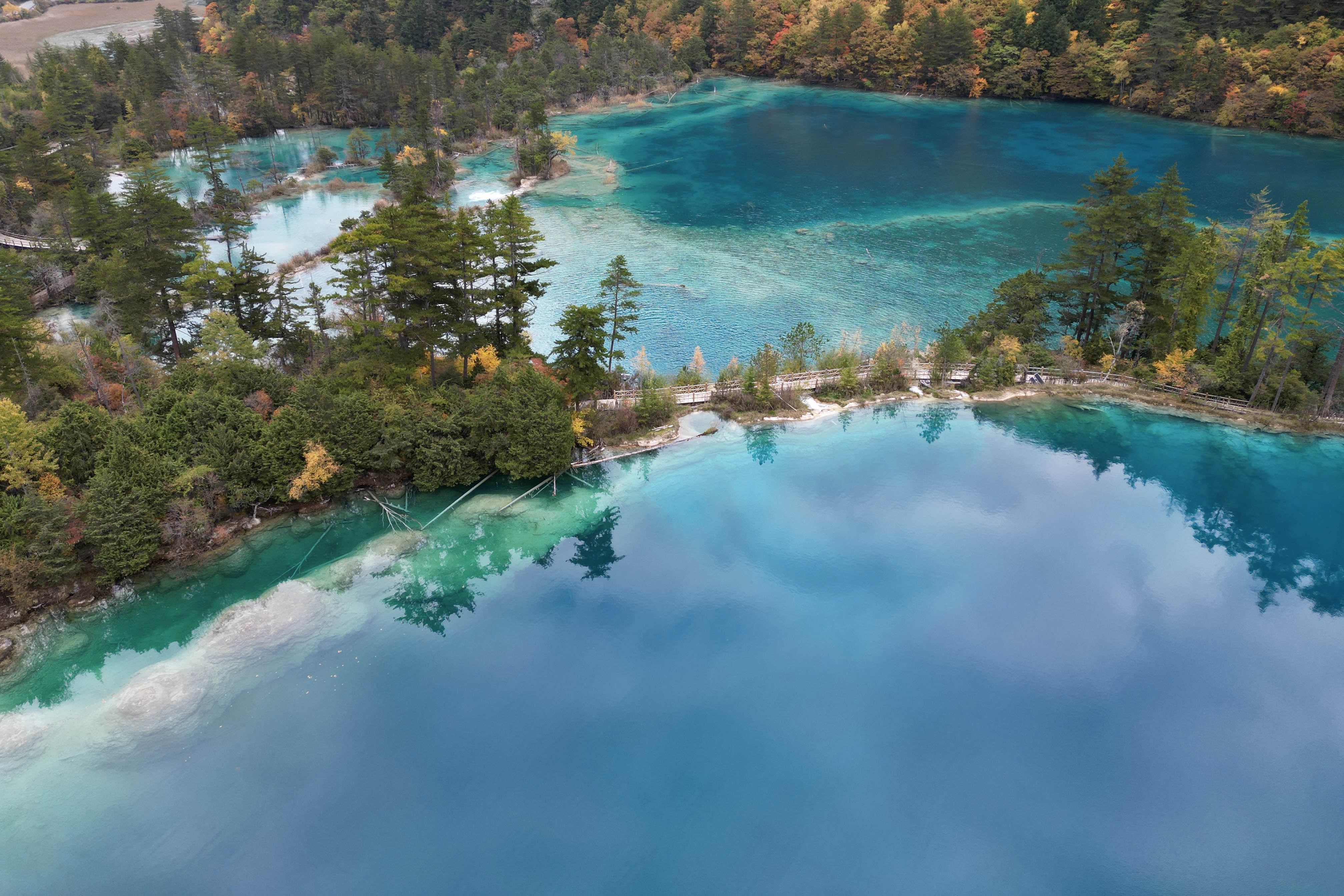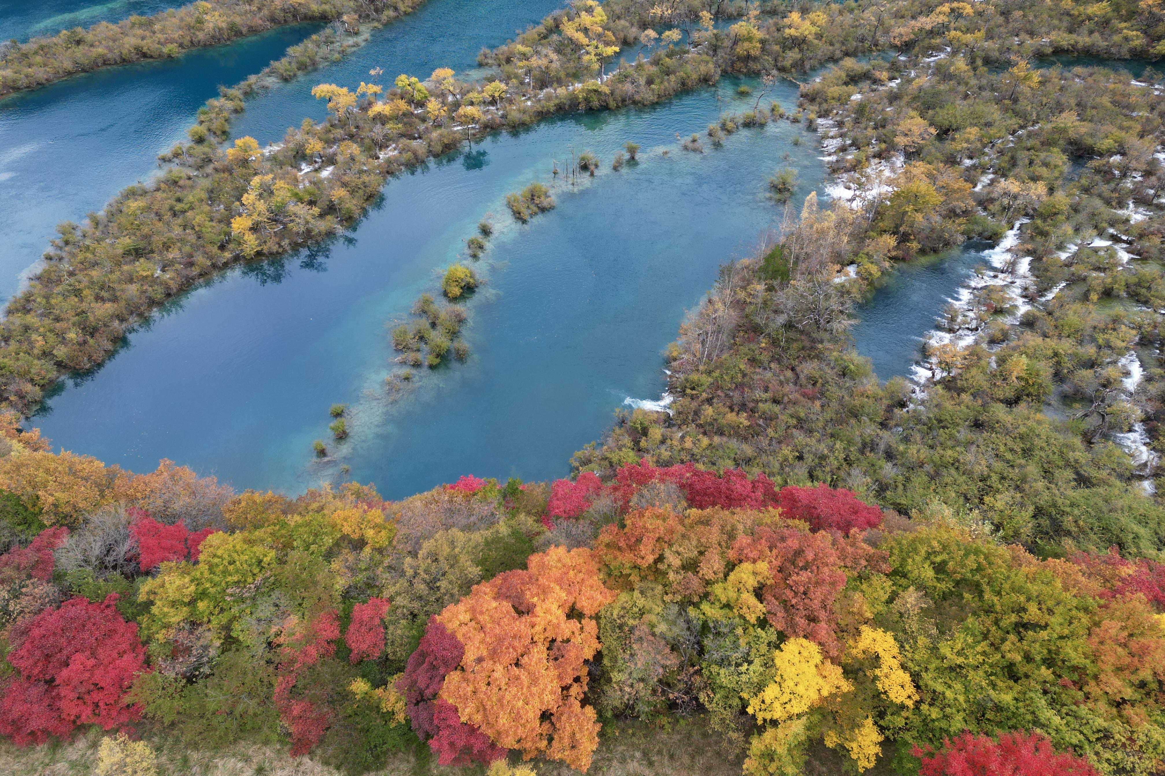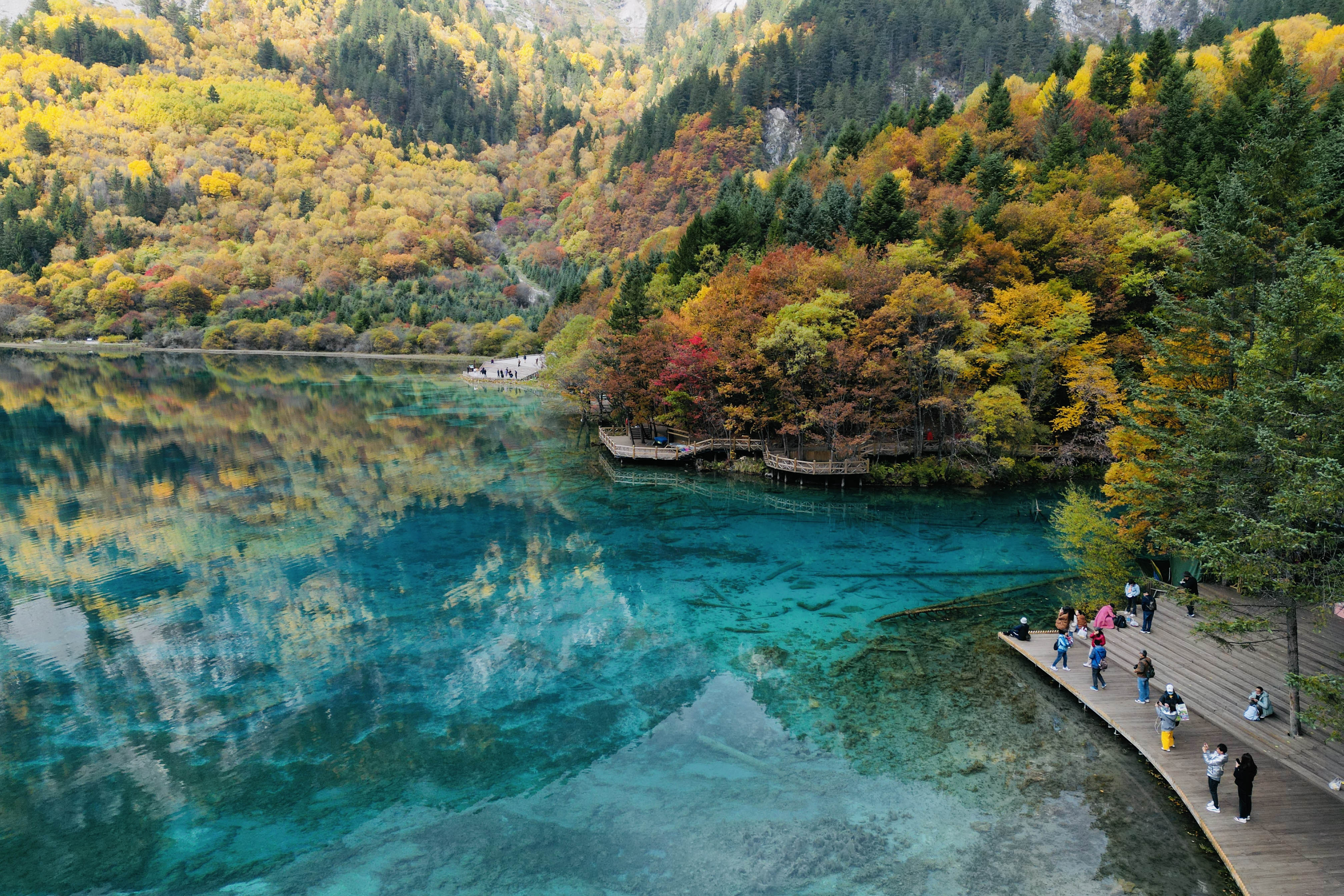 10月23日,俯瞰四川九寨沟景区。深秋的九寨沟漫山彩叶与清澈见底的湖水交相辉映,宛如画卷。(图片来源:中新社)