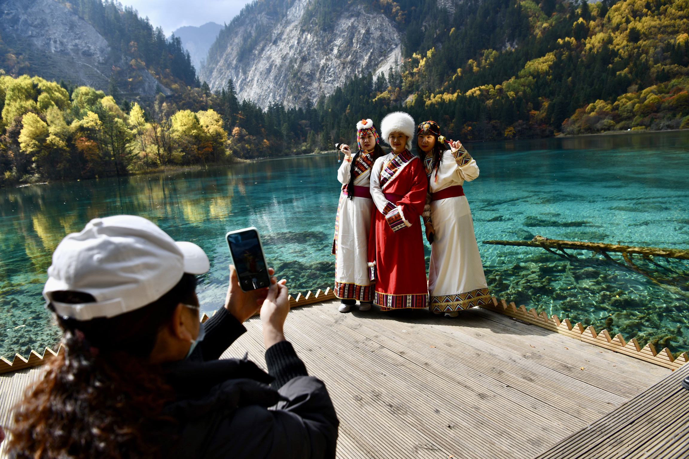 10月23日,四川九寨沟景区,游客拍照留念。(图片来源:中新社)