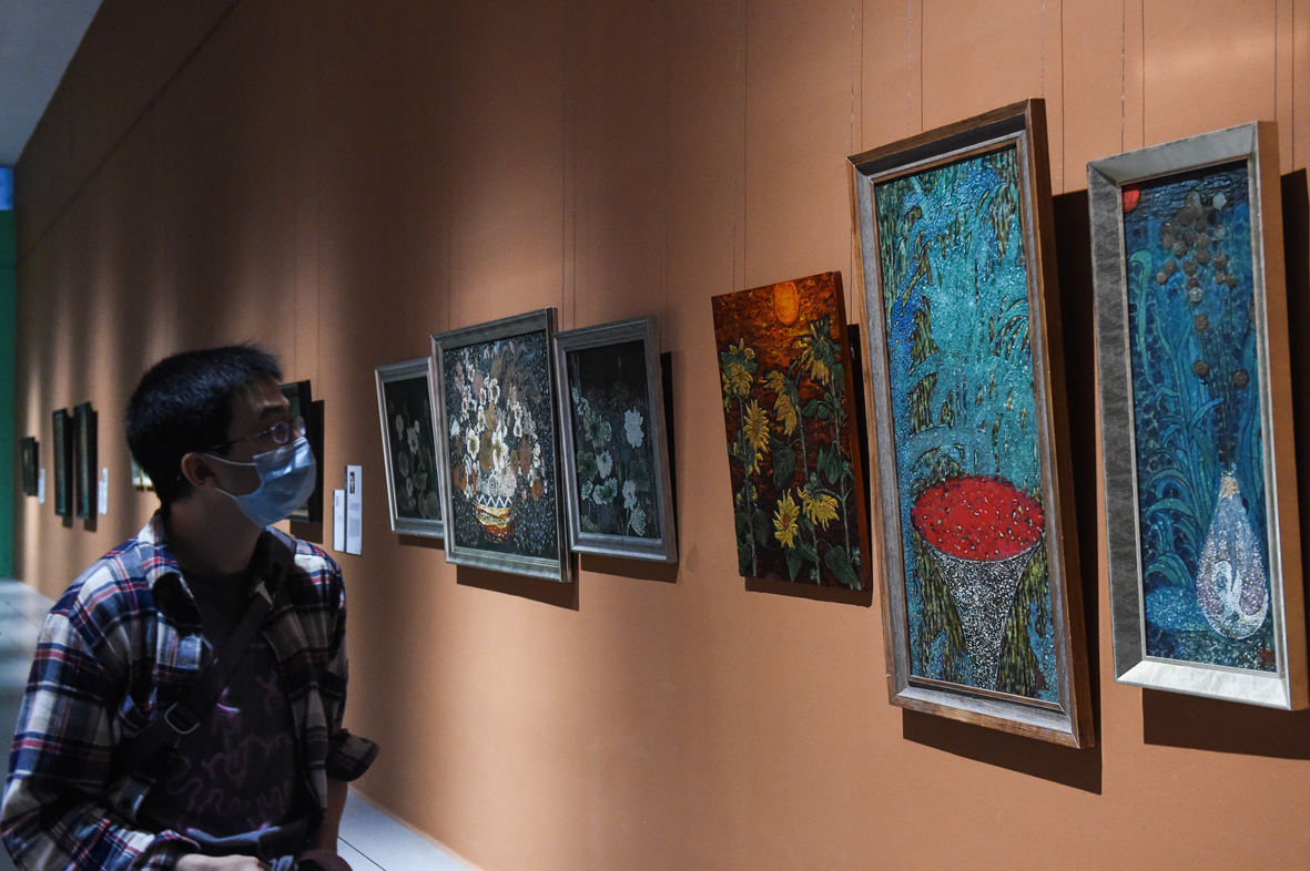 10月26日,重庆美术馆,漆画作品《“花”系列》吸引参观者。当日,2022重庆都市艺术节“匠心——重庆市首届工艺美术大师和非遗代表性传承人精品展”在重庆美术馆开展。(图片来源:中新社)