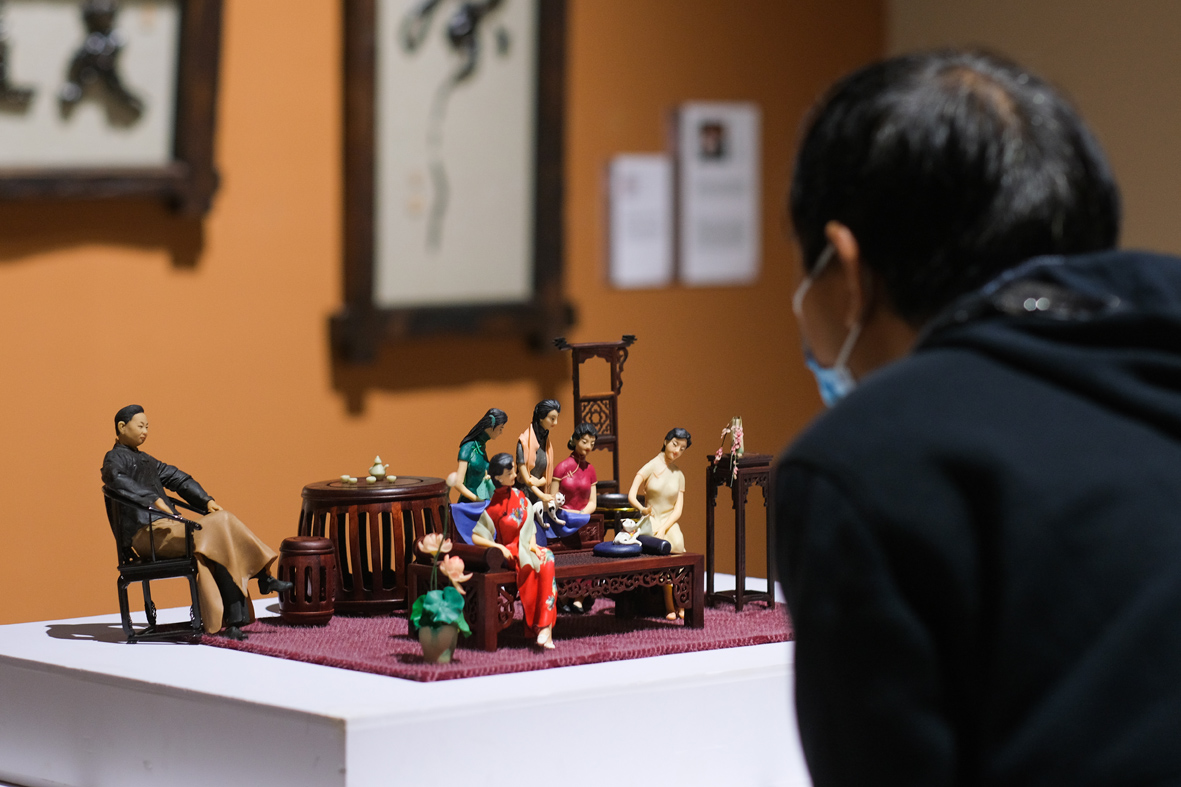 10月26日,重庆美术馆,面塑作品《惬》吸引参观者。(图片来源:中新社)