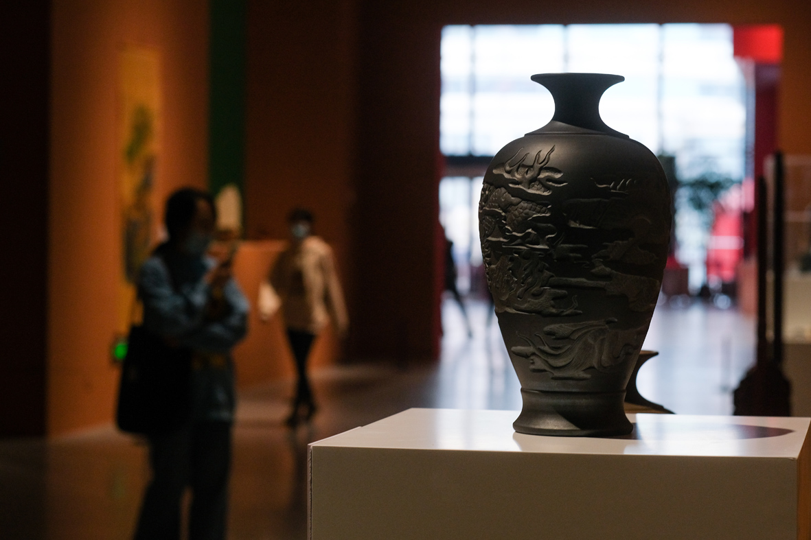 10月26日,重庆美术馆,国家级非遗重庆荣昌陶吸引参观者。(图片来源:中新社)