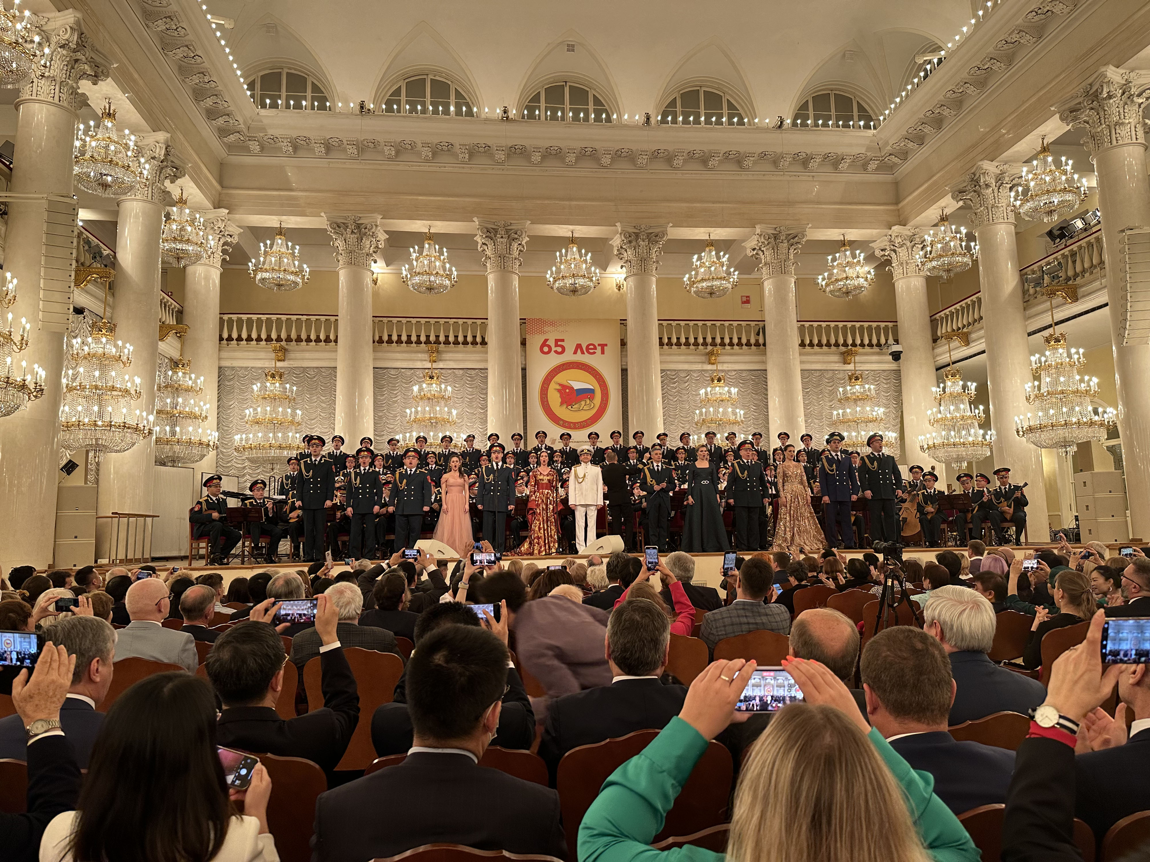 当地时间10月30日,俄罗斯中国友好协会成立65周年庆祝晚会在莫斯科工会大厦圆柱厅举行。俄罗斯军队亚历山大红旗歌舞团献上精彩演出。 (图片来源:中新社)