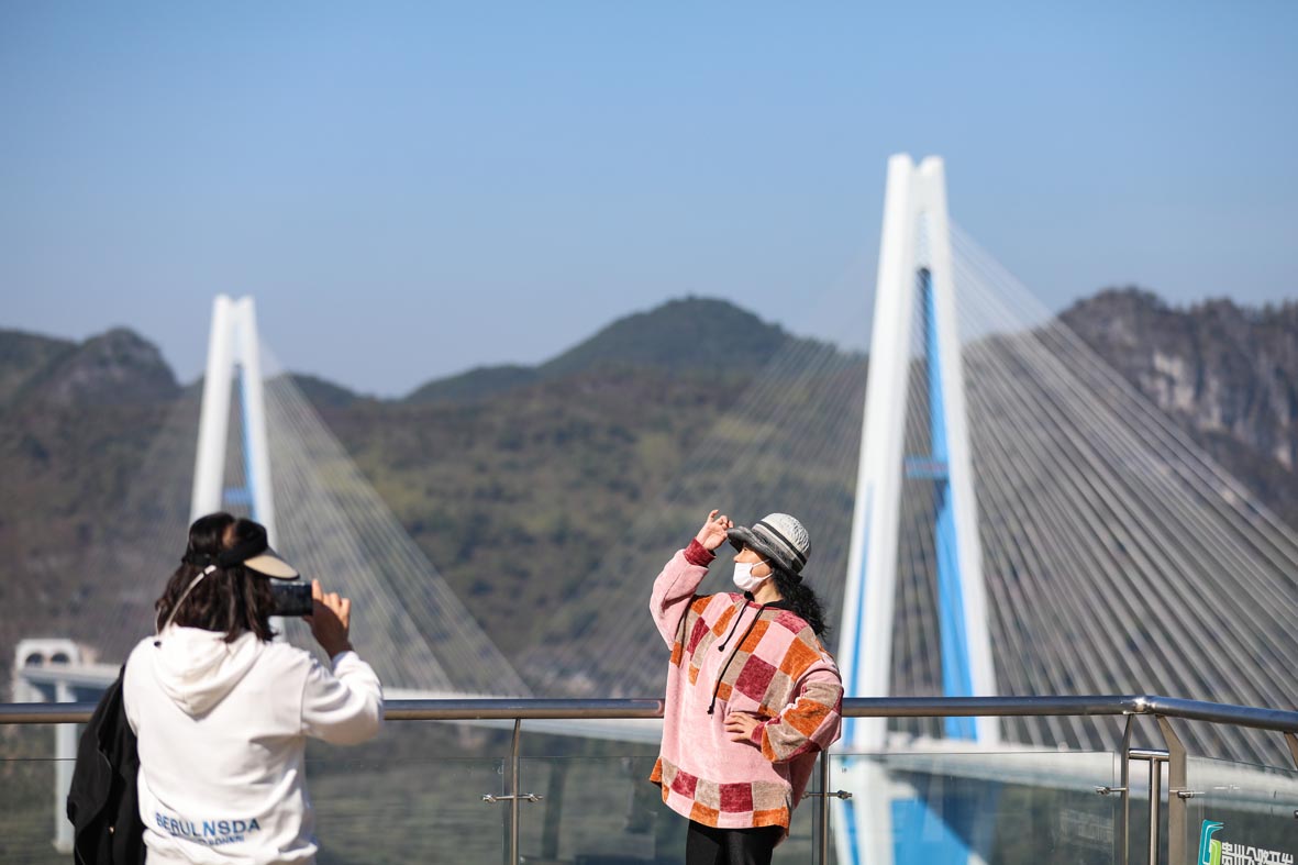 11月2日,贵州平塘,游客在“天空之桥”服务区观景台拍照。平(塘)罗(甸)高速公路“天空之桥”服务区位于贵州省黔南布依族苗族自治州平塘县境内。 (图片来源:中新社)