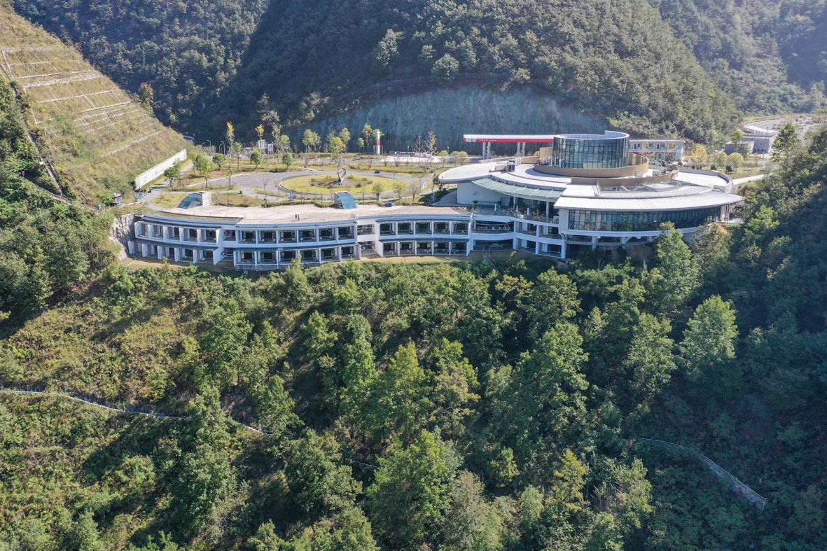 11月2日,航拍贵州平塘“天空之桥”服务区悬崖酒店。(图片来源:中新社)