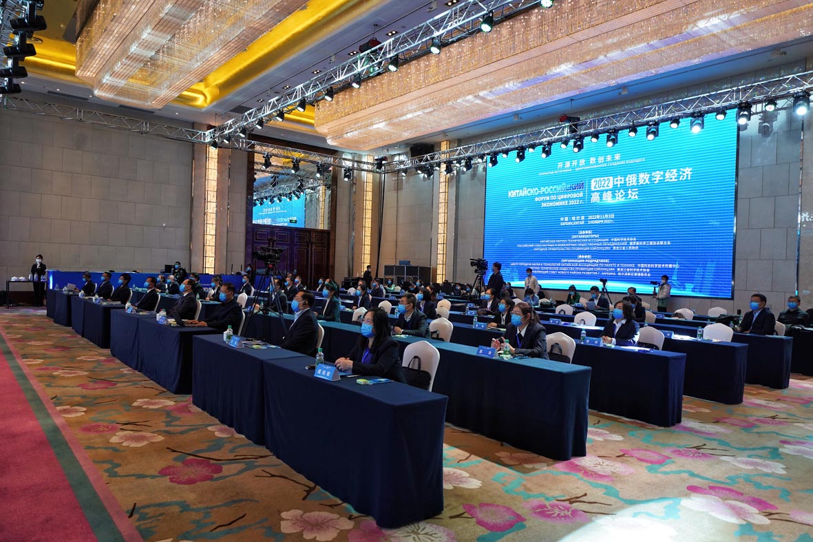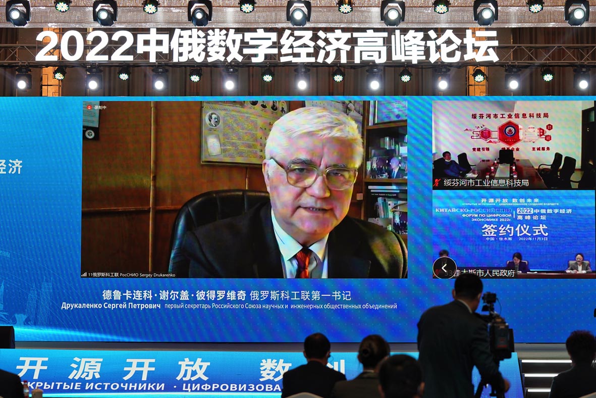 11月3日,以“开源开放数创未来”为主题的2022年中俄数字经济高峰论坛在中国北京、哈尔滨和俄罗斯莫斯科三地连线举行。图为哈尔滨分会场。 (图片来源:中新社)