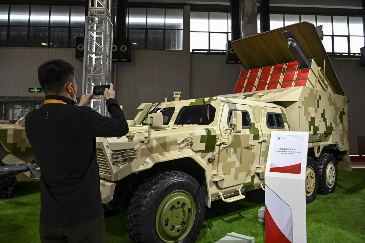 11月6日,广东省珠海市,轻型高机动车载蜂群武器系统在第十四届中国航展上展出,这也是该系统首次参展。当日,第十四届中国国际航空航天博览会举办媒体探营活动。本届航展将于11月8日至13日在珠海国际航展中心举行,吸引43个国家和地区的740多家企业、超110架飞机参展。 (图片来源:中新社)