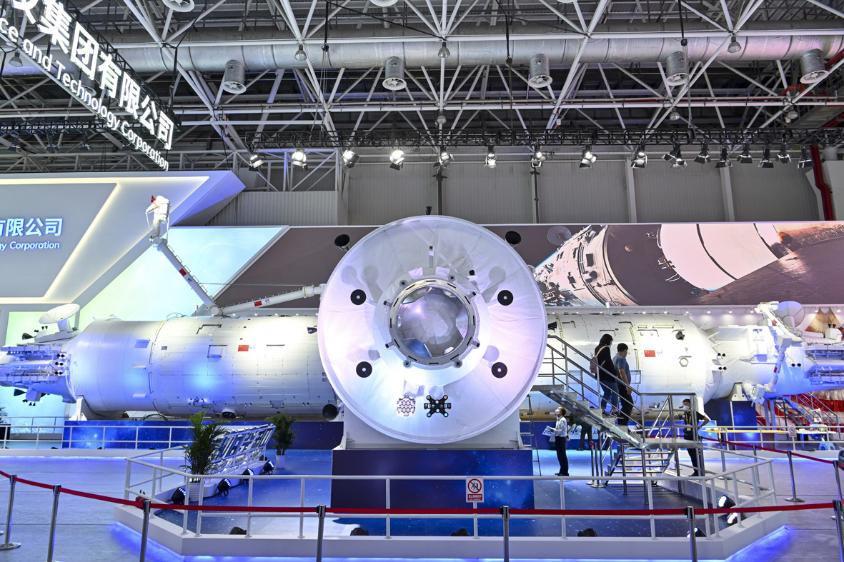 11月6日,广东省珠海市,第十四届中国航展上展出的“中国空间站”模型。(图片来源:中新社)