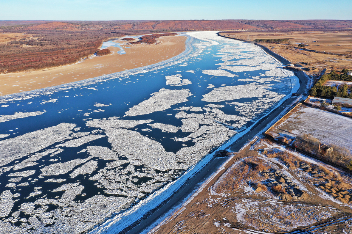 11月7日,黑龙江大兴安岭,中俄界江黑龙江呼玛段进入冬季流冰期。(图片来源:中新社)