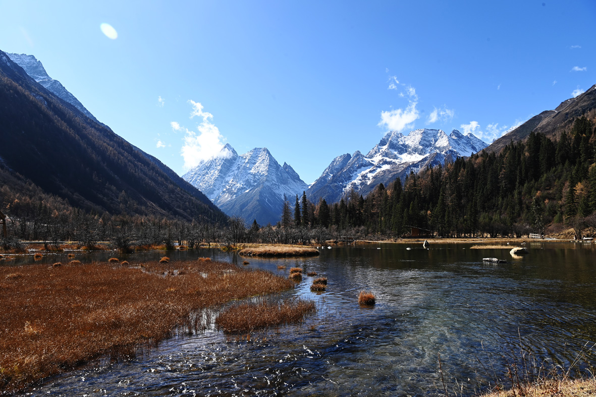 11月13日,四姑娘山双桥沟风光如画。双桥沟是四川省阿坝藏族羌族自治州四姑娘山景区三沟之一,全长40余公里,面积约216.6平方公里。沟内山势陡峭,曲折幽深,山水相依,草木相间,云遮雾绕,宛若仙境。图片来源:中新社