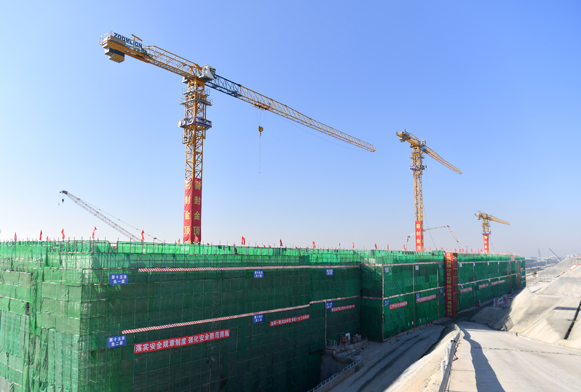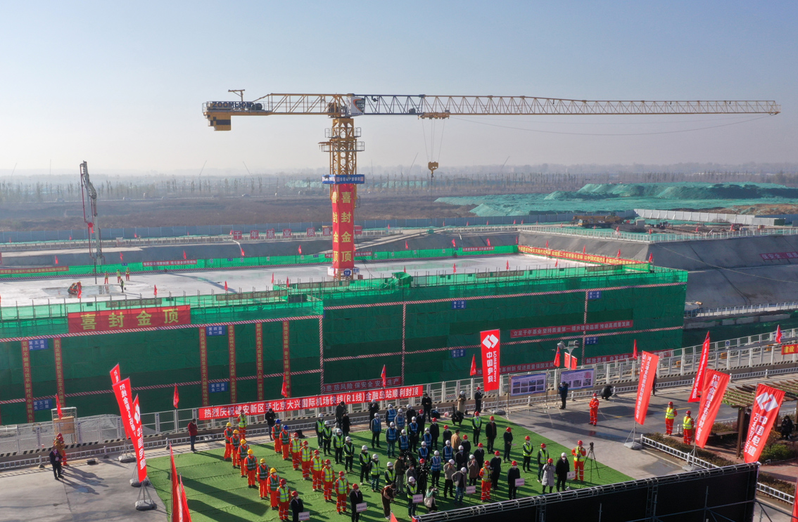 11月15日,由雄安集团轨道快线公司投资建设、中国电建市政集团承建的雄安R1线金融岛站最后一块顶板浇筑完成,标志着全线首个车站主体结构顺利封顶。据了解,R1线全称为雄安新区至北京大兴国际机场快线,南起雄安新区启动区,经廊坊市接入北京大兴国际机场,将与北京大兴机场线贯通运营。图为航拍R1线金融岛站主体结构封顶现场。(无人机照片)图片来源:中新社