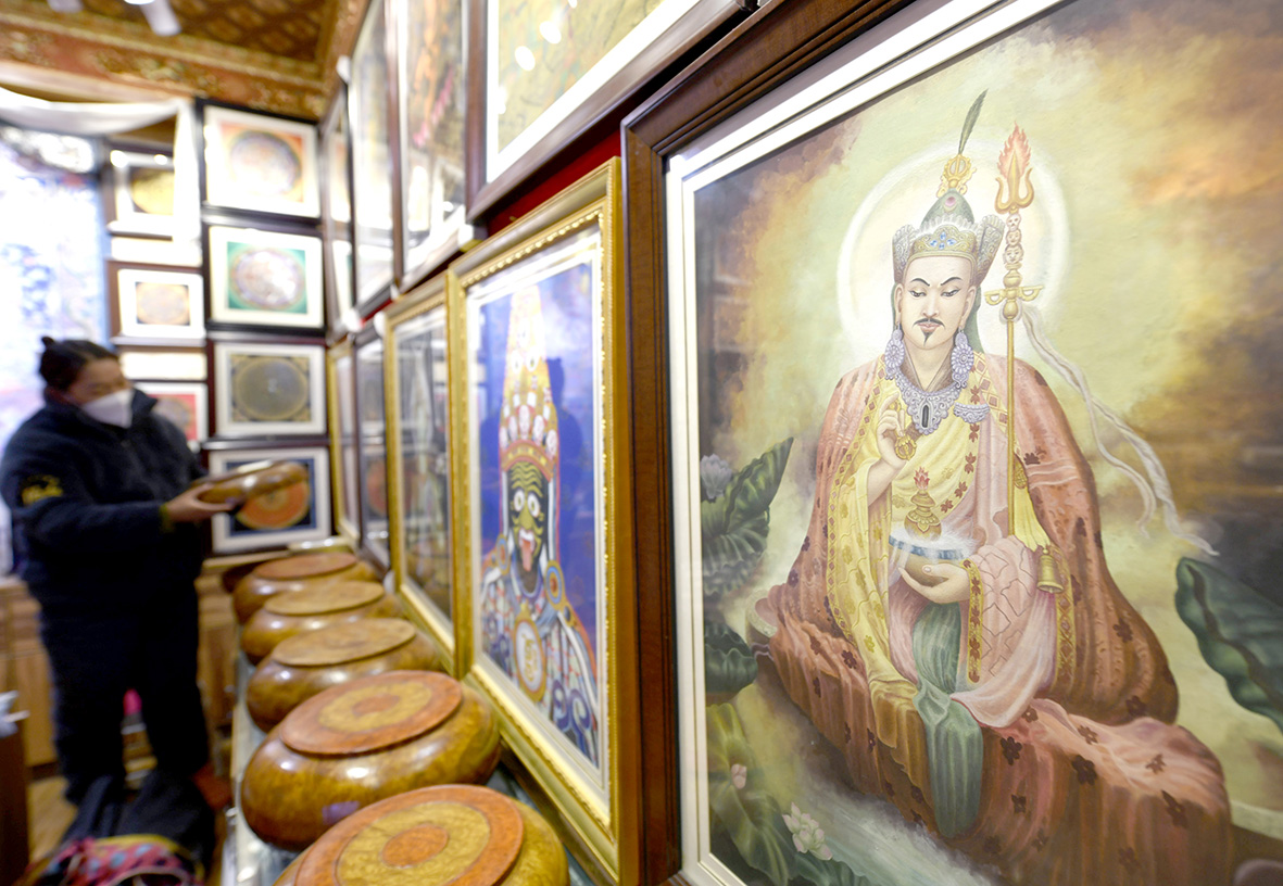 11月30日,拉萨古城八廓街一家唐卡店,店主正在擦拭店内物品。(图片来源:中新社)