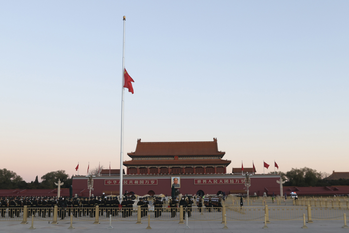 12月1日,北京天安门下半旗志哀。中国前领导人江泽民因病抢救无效于2022年11月30日在上海逝世。(图片来源:中新社)