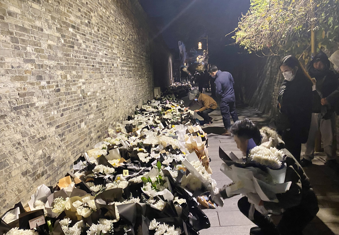 12月1日,在江苏扬州的江泽民旧居前,摆满了当地民众自发送来的鲜花,寄托民众的哀思。(图片来源:中新社)
