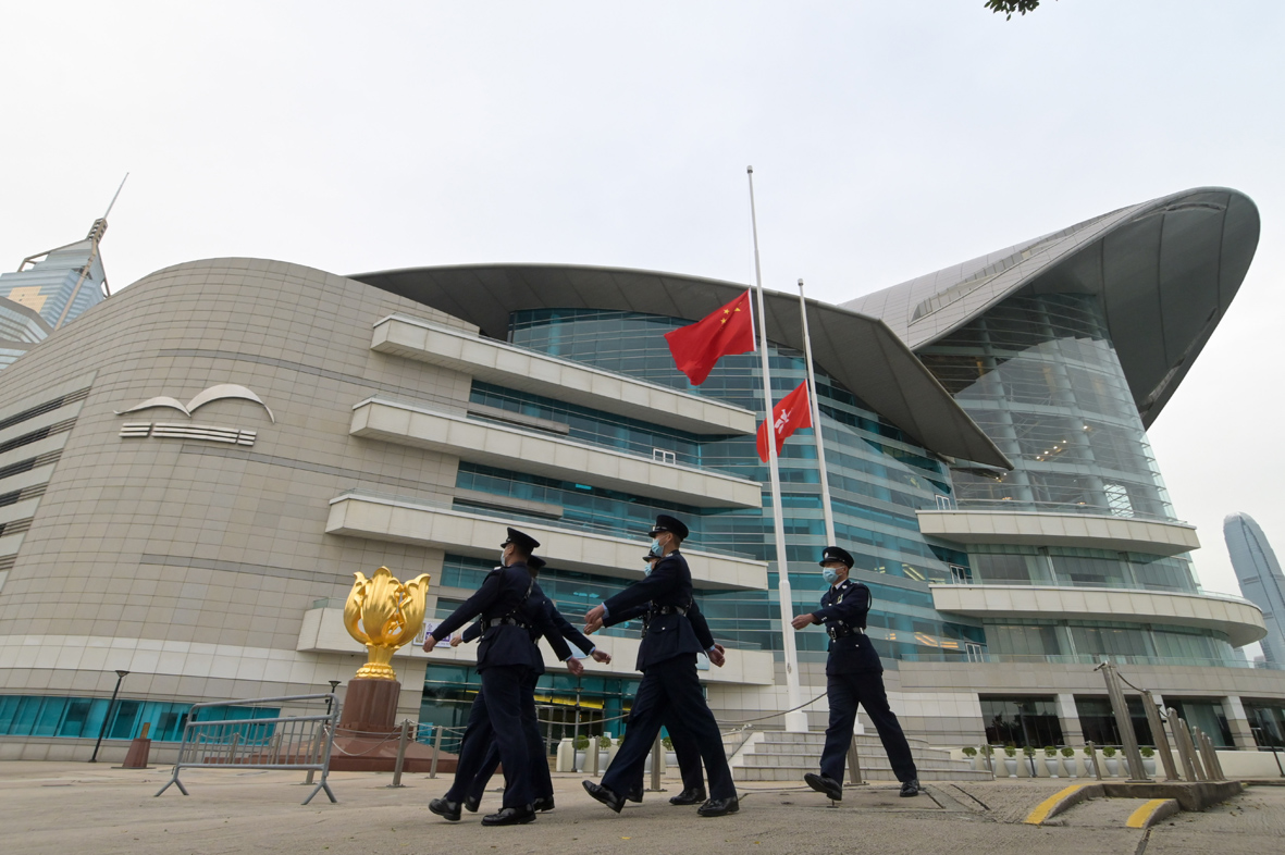 12月1日,香港特区政府总部、香港特区立法会综合大楼、香港特区司法机构办公楼、金紫荆广场等主要建筑物的国旗及香港特区区旗下半旗志哀,悼念江泽民逝世。图为金紫荆广场下半旗志哀。 (图片来源:中新社)