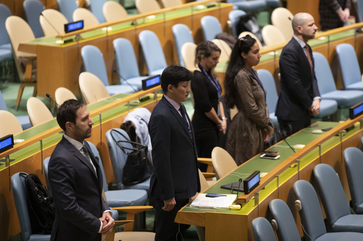 当地时间12月1日,第77届联合国大会在纽约联合国总部举行体育促进发展与和平一般性辩论,会前联大主席克勒希主持默哀仪式,哀悼中国前国家主席江泽民逝世,各国代表起立默哀一分钟。 (图片来源:中新社)