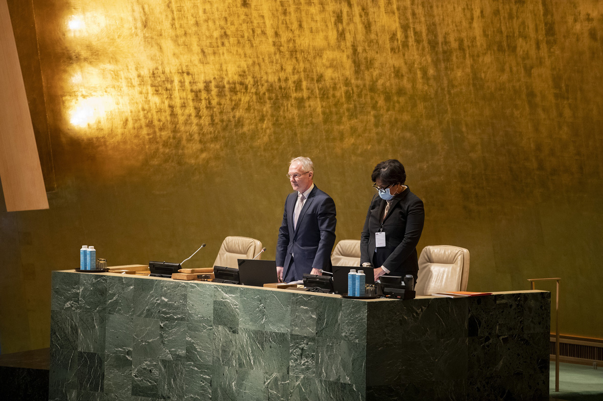 当地时间12月1日,第77届联合国大会在纽约联合国总部举行体育促进发展与和平一般性辩论,会前联大主席克勒希主持默哀仪式,哀悼中国前国家主席江泽民逝世,各国代表起立默哀一分钟。图为联大主席克勒希(左)主持默哀仪式。 (图片来源:中新社)