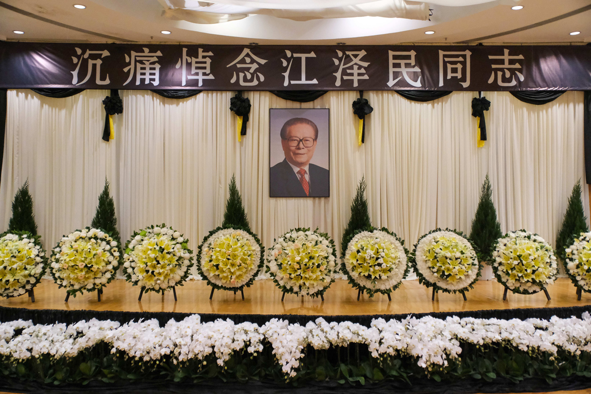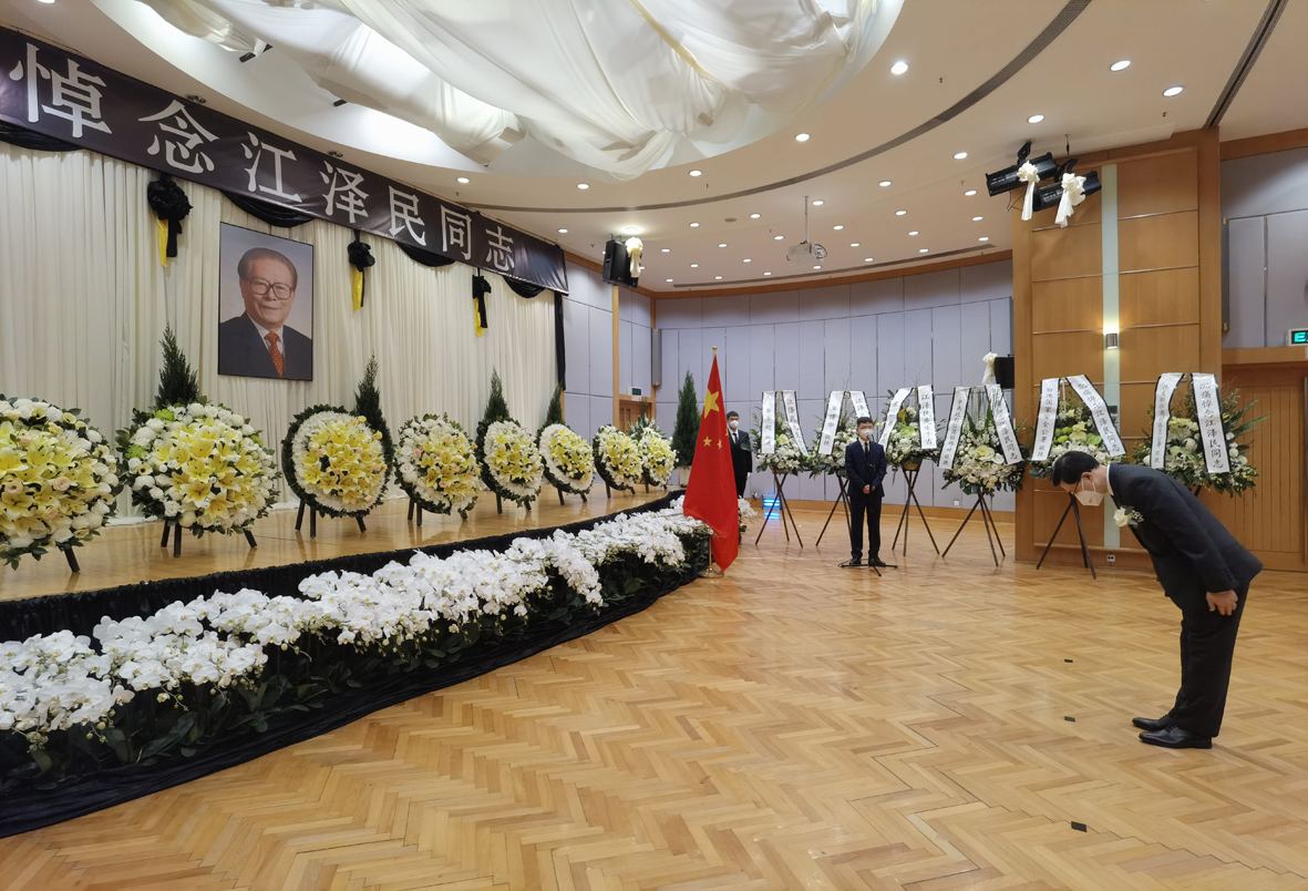 12月1日,中央人民政府驻香港特别行政区联络办公室在办公楼内设置灵堂,接受香港各界吊唁江泽民。(图片来源:中新社)
