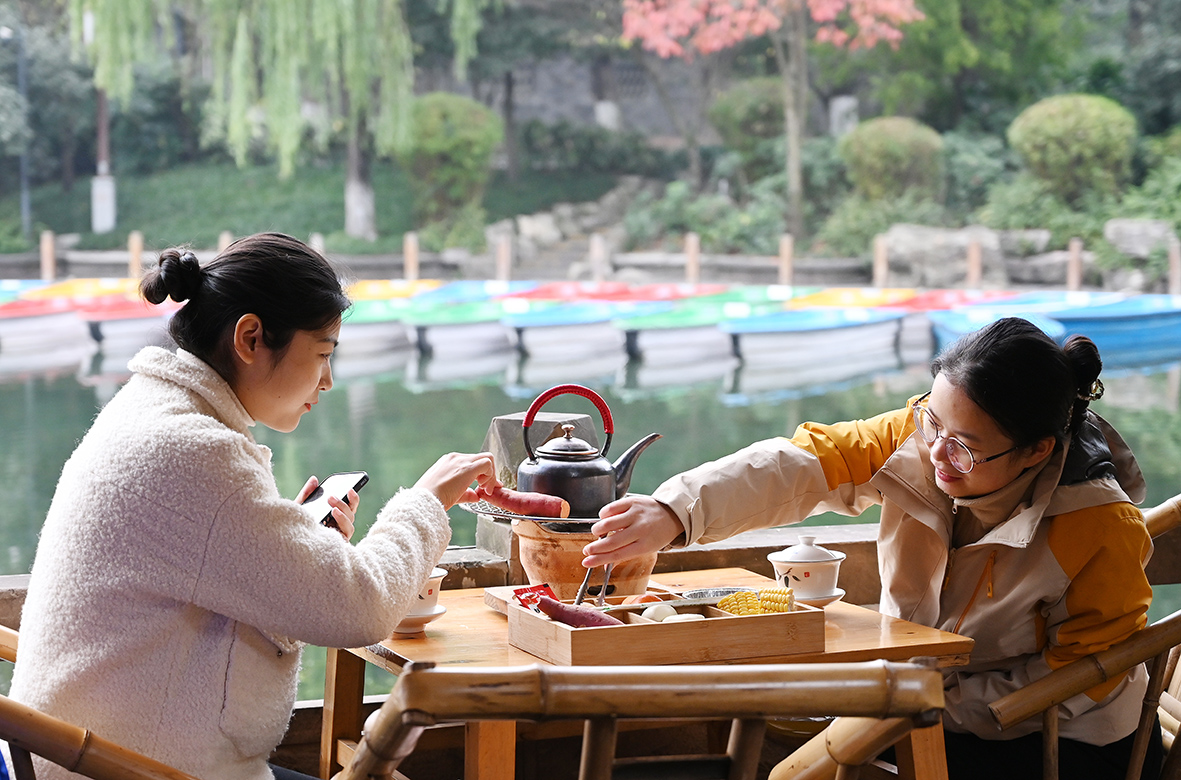 12月7日,四川成都,市民在茶馆里拍照打卡。(图片来源:中新社)
