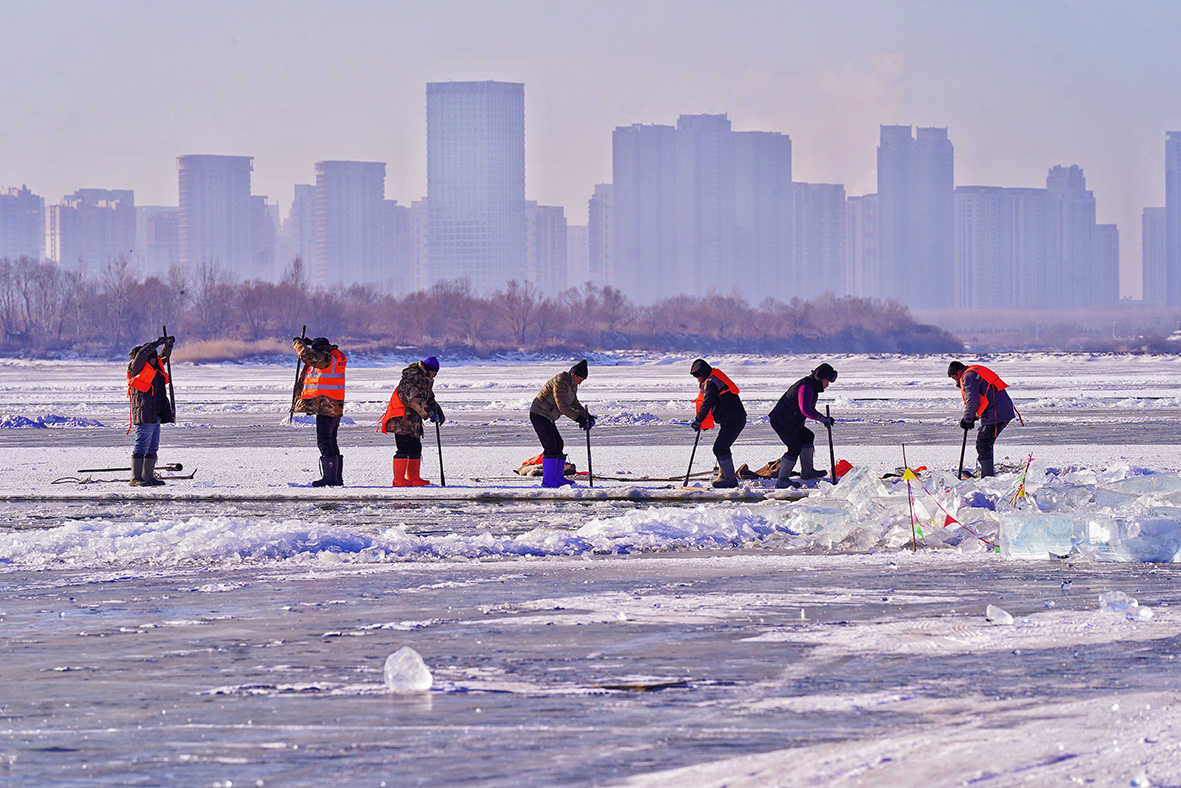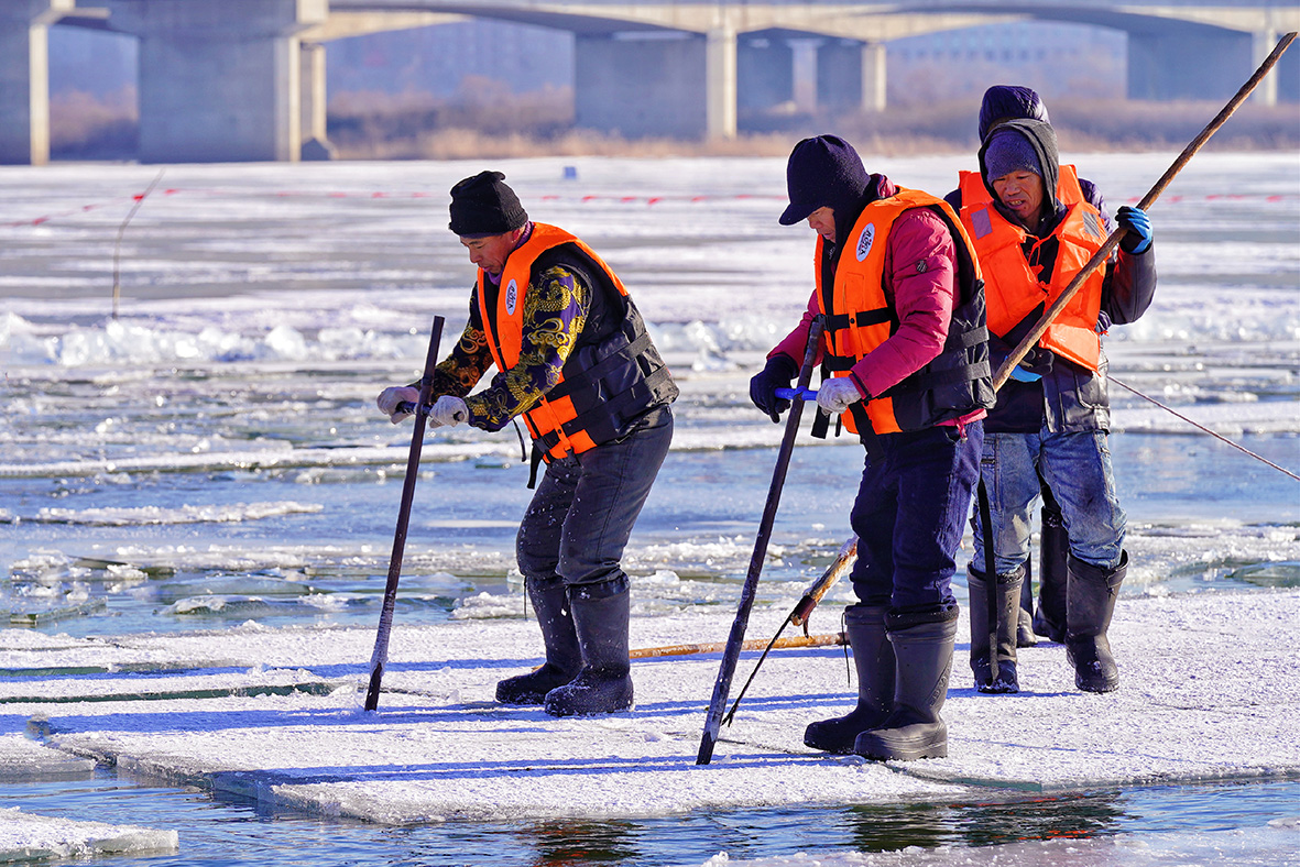 12月10日,黑龙江哈尔滨,工人们用冰镐凿冰。(图片来源:中新社)