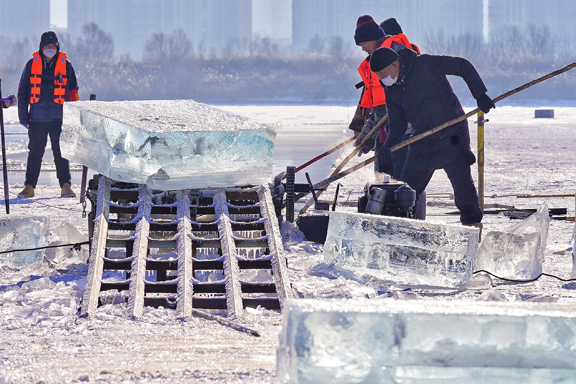 12月10日,黑龙江哈尔滨,采冰工人用工具将冰块分开。(图片来源:中新社)
